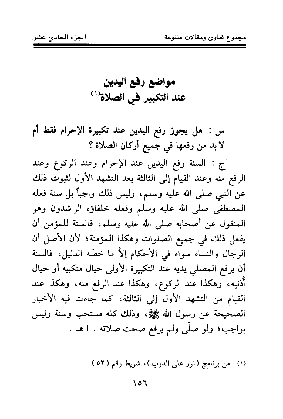 ج: السنة رفع اليدين عند الإحرام وعند الركوع وعند الرفع منه وعند القيام إلى الثالثة بعد التشهد الأول لثبوت ذلك عن النبي صلى الله عليه وسلم، وليس ذلك واجبا بل سنة فعله المصطفى صلى الله عليه وسلم وفعله خلفاؤه الراشدون وهو المنقول عن أصحابه صلى الله عليه وسلم، فالسنة للمؤمن أن يفعل ذلك في جميع الصلوات وهكذا المؤمنة؛ لأن الأصل أن الرجال والنساء سواء في الأحكام إلا ما خصه الدليل، فالسنة أن يرفع المصلي يديه عند التكبيرة الأولى حيال منكبيه أو حيال أذنيه، وهكذا عند الركوع، وهكذا عند الرفع منه، وهكذا عند القيام من التشهد الأول إلى الثالثة، كما جاءت فيه الأخبار الصحيحة عن رسول الله صلى الله عليه وسلم، وذلك كله مستحب وسنة وليس بواجب، ولو صلى ولم يرفع صحت صلاته اهـ.