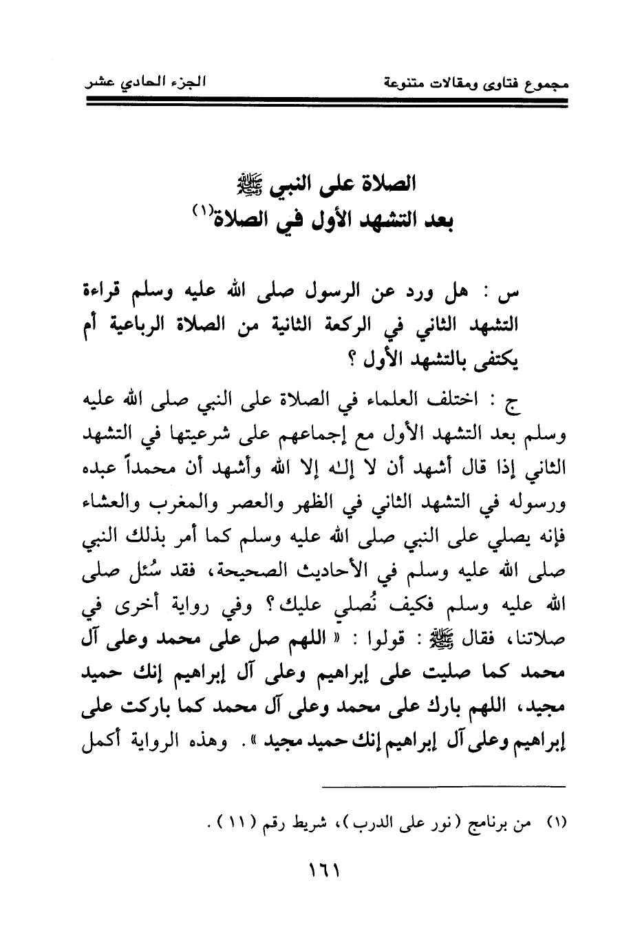 ج: اختلف العلماء في الصلاة على النبي صلى الله عليه وسلم بعد التشهد الأول مع إجماعهم على شرعيتها في التشهد الثاني إذا قال أشهد أن لا إله إلا الله وأشهد أن محمدا عبده ورسوله في التشهد الثاني في الظهر والعصر والمغرب والعشاء فإنه يصلي على النبي صلى الله عليه وسلم كما أمر بذلك النبي صلى الله عليه وسلم في الأحاديث الصحيحة، فقد سئل صلى الله عليه وسلم فكيف نصلي عليك؟ وفي رواية أخرى في صلاتنا، فقال صلى الله عليه وسلم: «قولوا اللهم صل على محمد وعلى آل محمد كما صليت على إبراهيم وعلى آل إبراهيم إنك حميد مجيد اللهم بارك على محمد وعلى آل محمد كما باركت على إبراهيم وعلى آل إبراهيم إنك حميد مجيد (¬1) » . وهذه الرواية أكمل