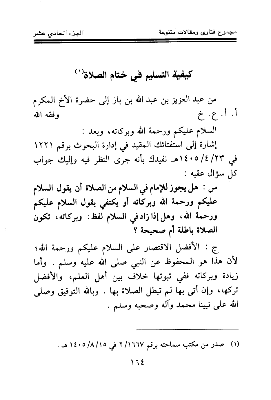 من عبد العزيز بن عبد الله بن باز إلى حضرة الأخ المكرم أ. أ. ع. خ وفقه الله. السلام عليكم ورحمة الله وبركاته، وبعد: