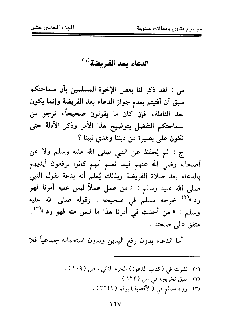 ج: لم يحفظ عن النبي صلى الله عليه وسلم ولا عن أصحابه رضي الله عنهم فيما نعلم أنهم كانوا يرفعون أيديهم بالدعاء بعد صلاة الفريضة وبذلك يعلم أنه بدعة لقول النبي صلى الله عليه وسلم: «من عمل عملا ليس عليه أمرنا فهو رد (¬1) » . خرجه مسلم في صحيحه. وقوله صلى الله عليه وسلم: «من أحدث في أمرنا هذا ما ليس منه فهو رد (¬2) » . متفق على صحته.