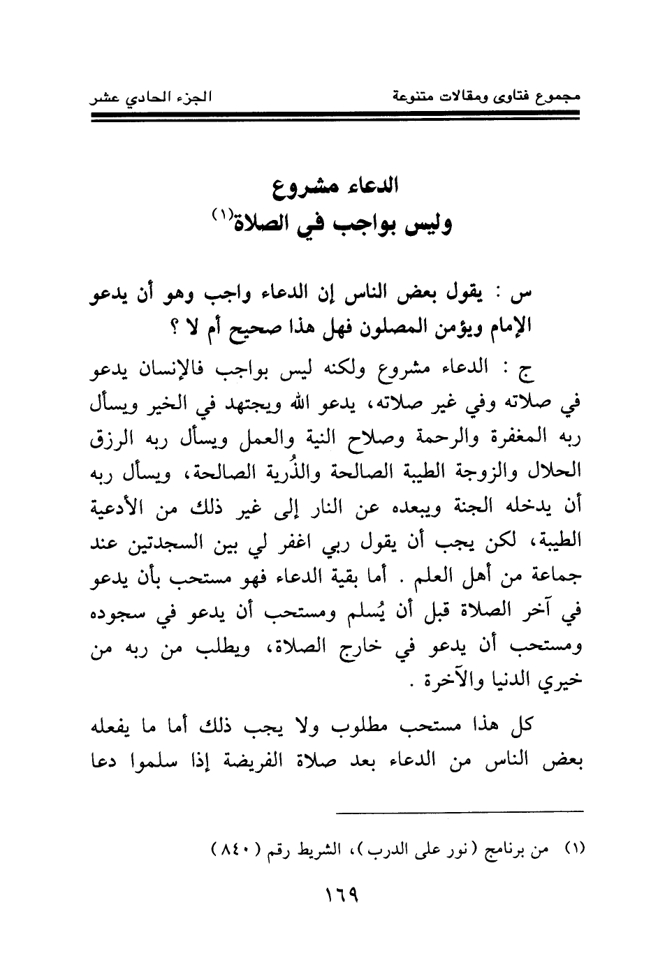 ج: الدعاء مشروع ولكنه ليس بواجب فالإنسان يدعو في صلاته وفي غير صلاته، يدعو الله ويجتهد في الخير ويسأل ربه المغفرة والرحمة وصلاح النية والعمل ويسأل ربه الرزق الحلال والزوجة الطيبة الصالحة والذرية الصالحة، ويسأل ربه أن يدخله الجنة ويبعده عن النار إلى غير ذلك من الأدعية الطيبة، لكن يجب أن يقول ربي اغفر لي بين السجدتين عند جماعة من أهل العلم. أما بقية الدعاء فهو مستحب بأن يدعو في آخر الصلاة قبل أن يسلم ومستحب أن يدعو في سجوده ومستحب أن يدعو في خارج الصلاة، ويطلب من ربه من خيري الدنيا والآخرة.