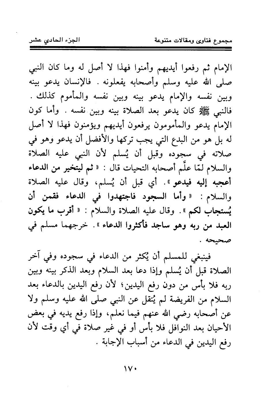الإمام ثم رفعوا أيديهم وأمنوا فهذا لا أصل له وما كان النبي صلى الله عليه وسلم وأصحابه يفعلونه. فالإنسان يدعو بينه وبين نفسه والإمام يدعو بينه وبين نفسه والمأموم كذلك. فالنبي صلى الله عليه وسلم كان يدعو بعد الصلاة بينه وبين نفسه. وأما كون الإمام يدعو والمأمومون يرفعون أيديهم ويؤمنون فهذا لا أصل له بل هو من البدع التي يجب تركها والأفضل أن يدعو وهو في صلاته في سجوده وقبل أن يسلم لأن النبي عليه الصلاة والسلام لما علم أصحابه التحيات قال: «ثم ليتخير من الدعاء أعجبه إليه فيدعو (¬1) » . أي قبل أن يسلم، وقال عليه الصلاة والسلام: «وأما السجود فاجتهدوا في الدعاء فقمن أن يستجاب لكم (¬2) » . وقال عليه الصلاة والسلام: «أقرب ما يكون العبد من ربه وهو ساجد فأكثروا الدعاء (¬3) » . خرجهما مسلم في صحيحه. فينبغي للمسلم أن يكثر من الدعاء في سجوده وفي آخر الصلاة قبل أن يسلم وإذا دعا بعد السلام وبعد الذكر بينه وبين ربه فلا بأس من دون رفع اليدين؛ لأن رفع اليدين بالدعاء بعد السلام من الفريضة لم ينقل عن النبي صلى الله عليه وسلم ولا عن أصحابه رضي الله عنهم فيما نعلم، وإذا رفع يديه في بعض الأحيان بعد النوافل فلا بأس أو في غير صلاة في أي وقت لأن رفع اليدين في الدعاء من أسباب الإجابة.