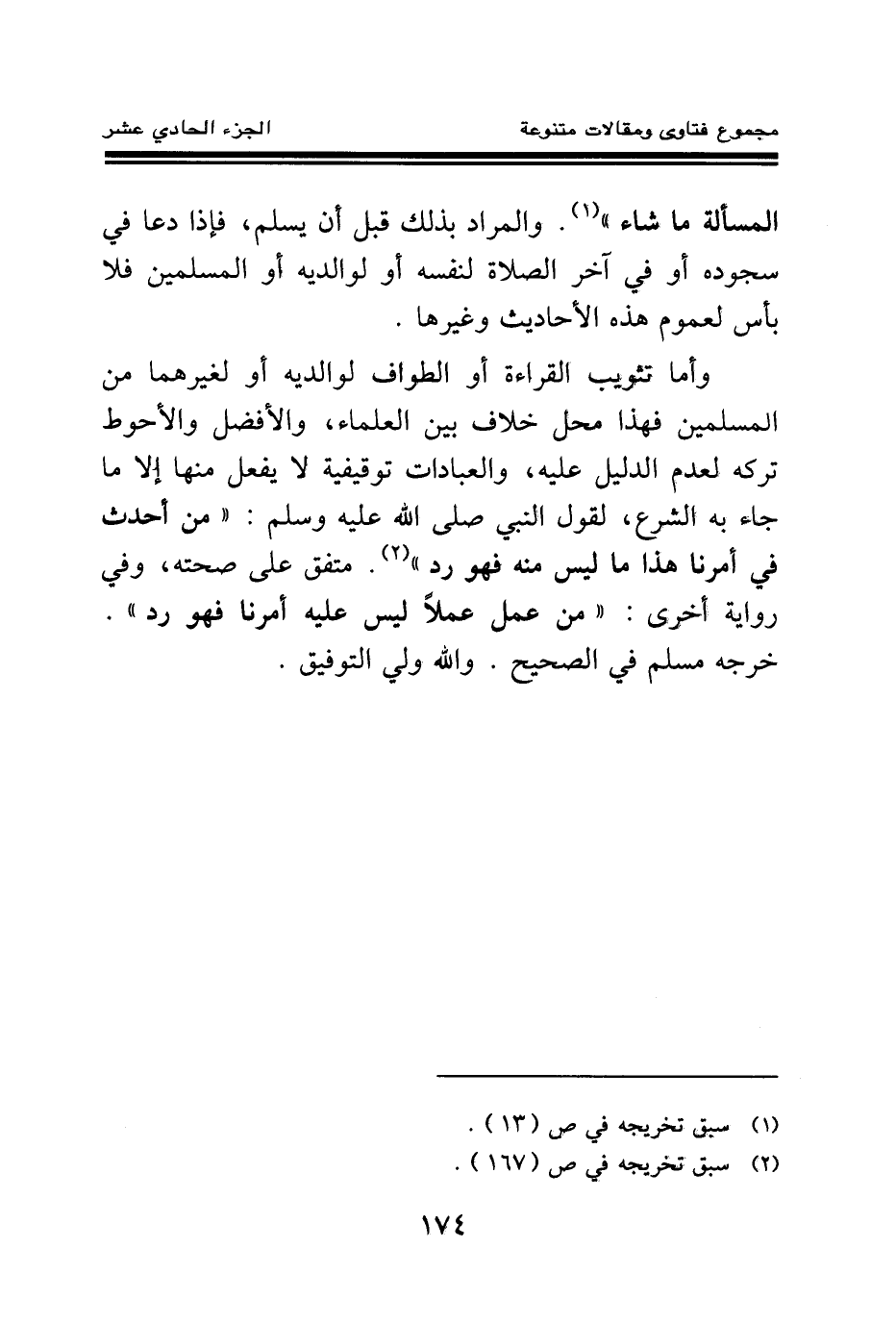 وأما تثويب القراءة أو الطواف لوالديه أو لغيرهما من المسلمين فهذا محل خلاف بين العلماء، والأفضل والأحوط تركه لعدم الدليل عليه، والعبادات توقيفية لا يفعل منها إلا ما جاء به الشرع، لقول النبي صلى الله عليه وسلم: «من أحدث في أمرنا هذا ما ليس منه فهو رد (¬2) » . متفق على صحته، وفي رواية أخرى: «من عمل عملا ليس عليه أمرنا فهو رد (¬3) » . خرجه مسلم في الصحيح. والله ولي التوفيق.