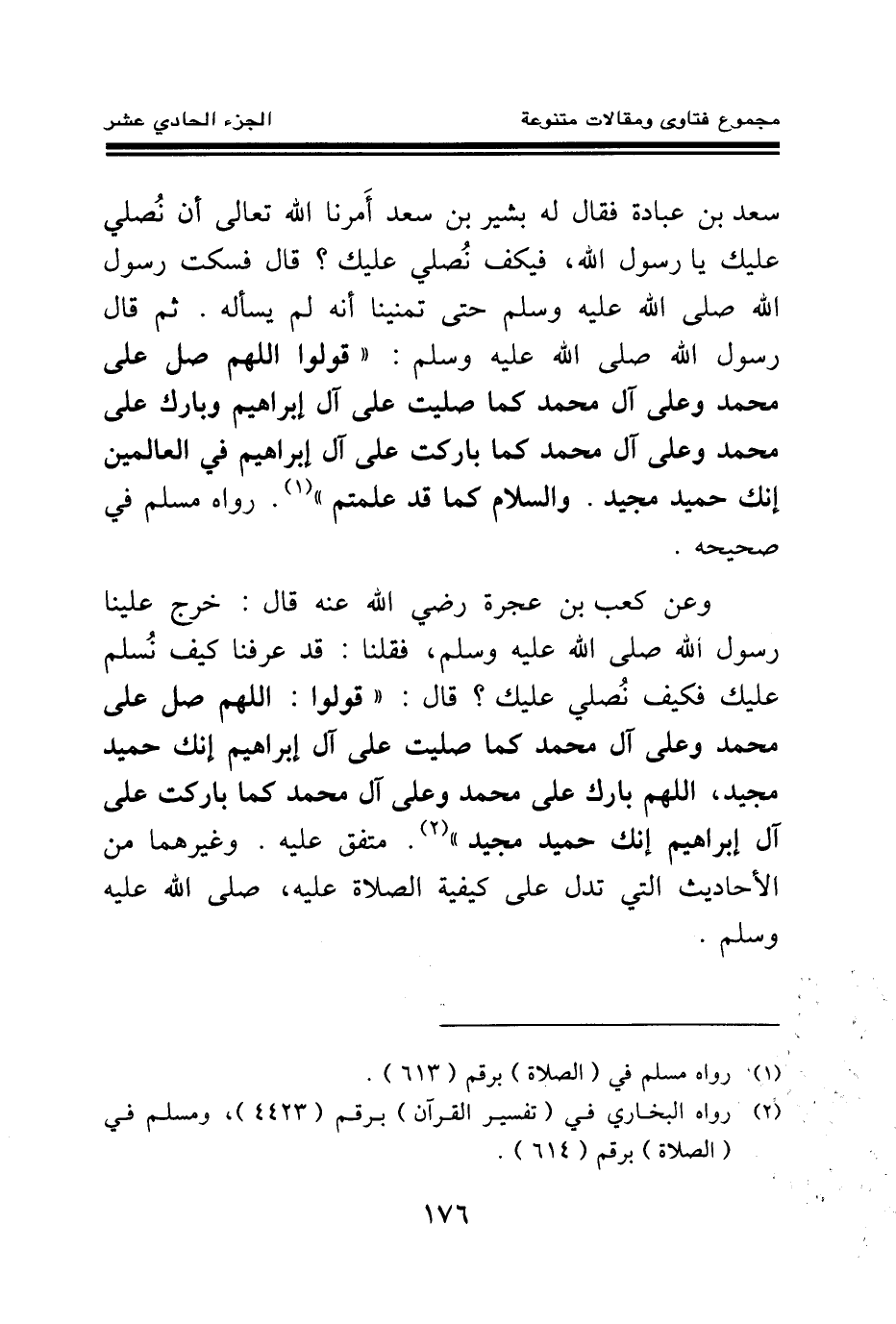 وعن كعب بن عجرة رضي الله عنه قال: خرج علينا رسول الله صلى الله عليه وسلم، فقلنا: «قد عرفنا كيف نسلم عليك فكيف نصلي عليك؟ قال: قولوا اللهم صل على محمد وعلى آل محمد كما صليت على آل إبراهيم إنك حميد مجيد اللهم بارك على محمد وعلى آل محمد كما باركت على آل إبراهيم إنك حميد مجيد» . متفق عليه. وغيرهما من الأحاديث التي تدل على كيفية الصلاة عليه، صلى الله عليه وسلم.