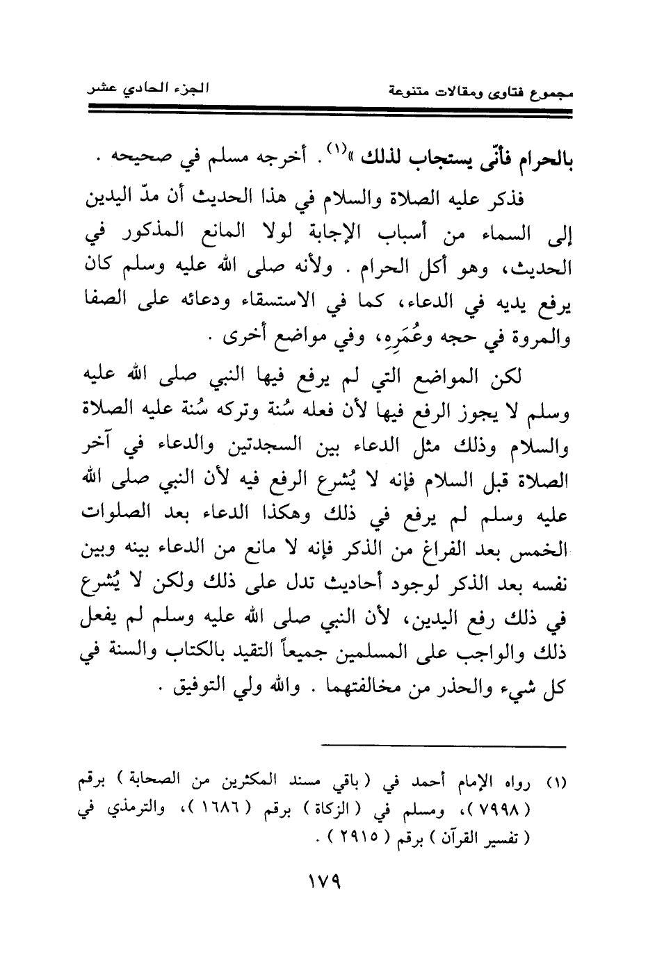 فذكر عليه الصلاة والسلام في هذا الحديث أن مد اليدين إلى السماء من أسباب الإجابة لولا المانع المذكور في الحديث، وهو أكل الحرام. ولأنه صلى الله عليه وسلم كان يرفع يديه في الدعاء، كما في الاستسقاء ودعائه على الصفا والمروة في حجه وعمره، وفي مواضع أخرى.