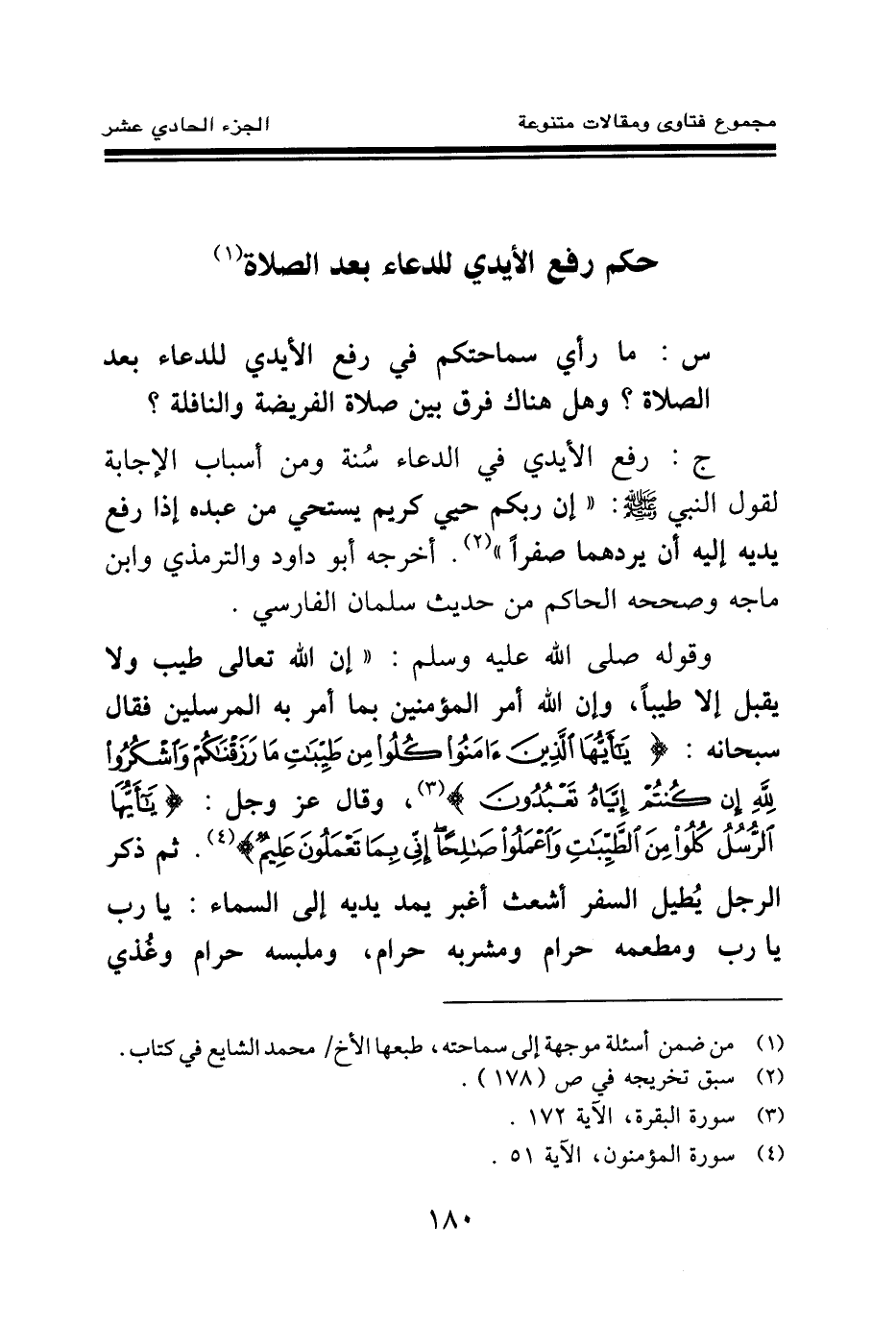 ج: رفع الأيدي في الدعاء سنة ومن أسباب الإجابة لقول النبي صلى الله عليه وسلم: «إن ربكم حيي كريم يستحيي من عبده إذا رفع يديه إليه أن يردهما صفرا (¬1) » أخرجه أبو داود والترمذي وابن ماجه وصححه الحاكم من حديث سلمان الفارسي. وقوله صلى الله عليه وسلم: «إن الله تعالى طيب ولا يقبل إلا طيبا وإن الله أمر المؤمنين بما أمر به المرسلين فقال سبحانه وقال عز وجل: ثم ذكر الرجل يطيل السفر أشعث أغبر يمد يديه إلى السماء: يا رب يا رب ومطعمه حرام ومشربه حرام وملبسه حرام وغذي