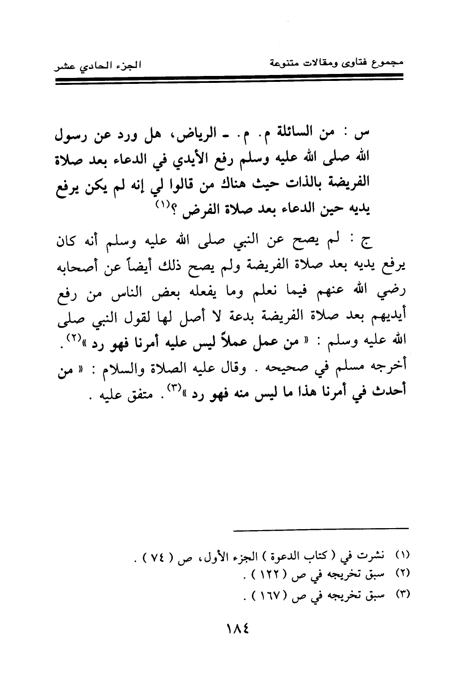 ج: لم يصح عن النبي صلى الله عليه وسلم أنه كان يرفع يديه بعد صلاة الفريضة ولم يصح ذلك أيضا عن أصحابه رضي الله عنهم فيما نعلم وما يفعله بعض الناس من رفع أيديهم بعد صلاة الفريضة بدعة لا أصل لها لقول النبي صلى الله عليه وسلم: «من عمل عملا ليس عليه أمرنا فهو رد (¬2) » . أخرجه مسلم في صحيحه.