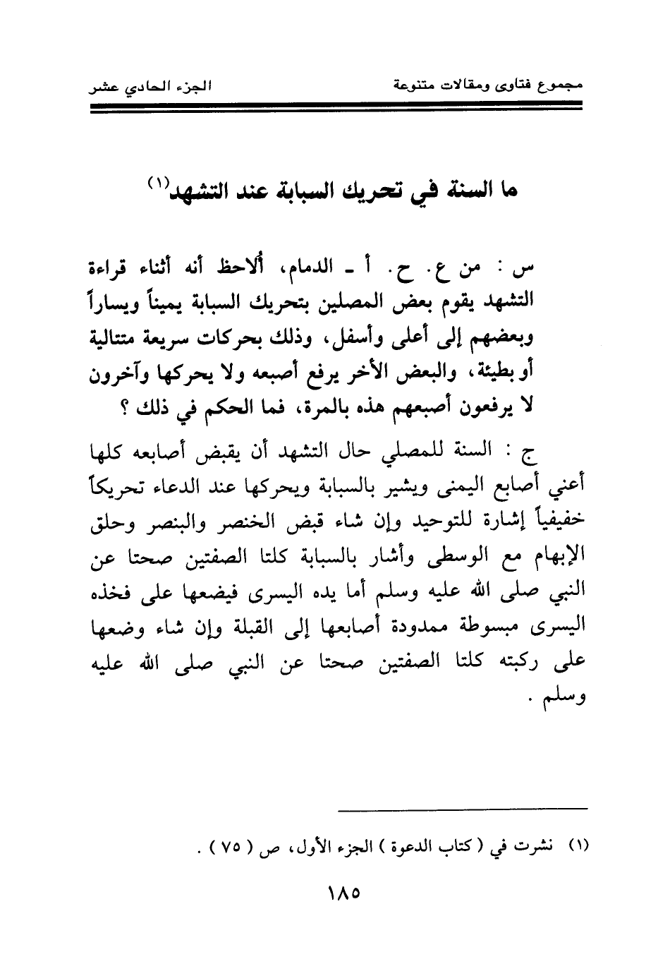 س: من ع. ح. أ- الدمام، ألاحظ أنه أثناء قراءة التشهد يقوم بعض المصلين بتحريك السبابة يمينا ويسارا وبعضهم إلى أعلى وأسفل، وذلك بحركات سريعة متتالية أو بطيئة، والبعض الآخر يرفع أصبعه ولا يحركها وآخرون لا يرفعون أصبعهم هذه بالمرة، فما الحكم في ذلك؟ .