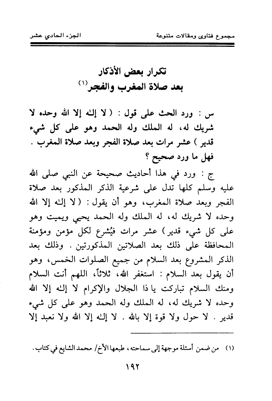 ج: ورد في هذا أحاديث صحيحة عن النبي صلى الله عليه وسلم كلها تدل على شرعية الذكر المذكور بعد صلاة الفجر وبعد صلاة المغرب، وهو أن يقول: لا إله إلا الله وحده لا شريك له، له الملك وله الحمد يحيي ويميت وهو على كل شيء قدير عشر مرات فيشرع لكل مؤمن ومؤمنة المحافظة على ذلك بعد الصلاتين المذكورتين. وذلك بعد الذكر المشروع بعد السلام من جميع الصلوات الخمس، وهو أن يقول بعد السلام: أستغفر الله، ثلاثا، اللهم أنت السلام ومنك السلام تباركت يا ذا الجلال والإكرام لا إله إلا الله وحده لا شريك له، له الملك وله الحمد وهو على كل شيء قدير. لا حول ولا قوة إلا بالله. لا إله إلا الله ولا نعبد إلا
