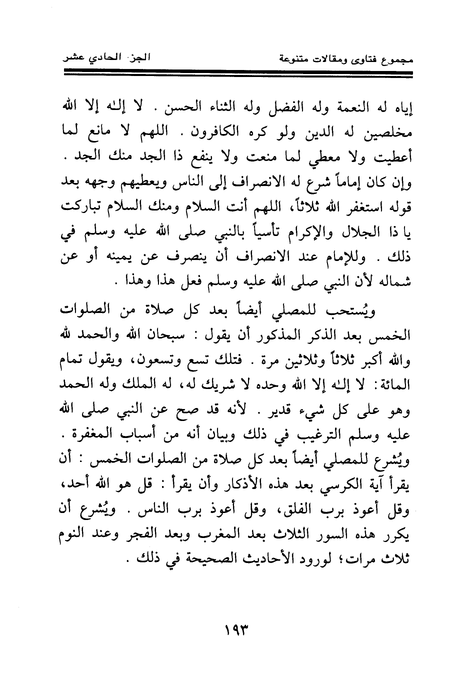 إياه له النعمة وله الفضل وله الثناء الحسن. لا إله إلا الله مخلصين له الدين ولو كره الكافرون. اللهم لا مانع لما أعطيت ولا معطي لما منعت ولا ينفع ذا الجد منك الجد. وإن كان إماما شرع له الانصراف إلى الناس ويعطيهم وجهه بعد قوله أستغفر الله ثلاثا، اللهم أنت السلام ومنك السلام تباركت يا ذا الجلال والإكرام تأسيا بالنبي صلى الله عليه وسلم في ذلك. وللإمام عند الانصراف أن ينصرف عن يمينه أو عن شماله لأن النبي صلى الله عليه وسلم فعل هذا وهذا. ويستحب للمصلي أيضا بعد كل صلاة من الصلوات الخمس بعد الذكر المذكور أن يقول: سبحان الله والحمد لله والله أكبر ثلاثا وثلاثين مرة. فتلك تسع وتسعون، ويقول تمام المائة: لا إله إلا الله وحده لا شريك له، له الملك وله الحمد وهو على كل شيء قدير؛ لأنه قد صح عن النبي صلى الله عليه وسلم الترغيب في ذلك وبيان أنه من أسباب المغفرة. ويشرع للمصلي أيضا بعد كل صلاة من الصلوات الخمس: أن يقرأ آية الكرسي بعد هذه الأذكار وأن يقرأ: قل هو الله أحد، وقل أعوذ برب الفلق، وقل أعوذ برب الناس. ويشرع أن يكرر هذه السور الثلاث بعد المغرب وبعد الفجر وعند النوم ثلاث مرات؛ لورود الأحاديث الصحيحة في ذلك.