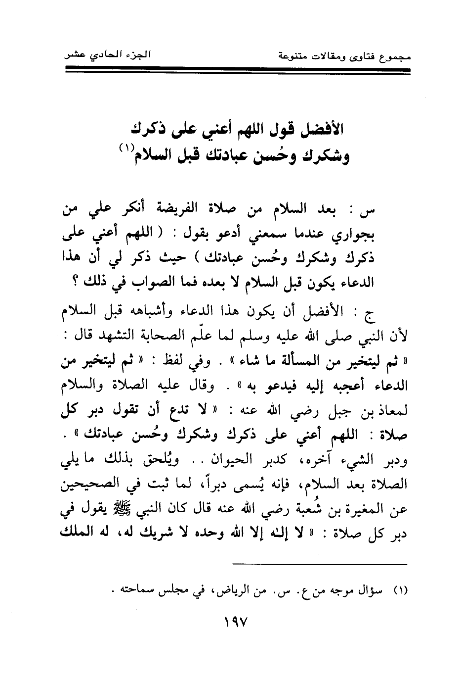 ج: الأفضل أن يكون هذا الدعاء وأشباهه قبل السلام لأن النبي صلى الله عليه وسلم لما علم الصحابة التشهد قال: «ثم ليتخير من المسألة ما شاء (¬1) » . وفي لفظ: «ثم ليتخير من الدعاء أعجبه إليه فيدعو به (¬2) » . وقال عليه الصلاة والسلام لمعاذ بن جبل رضي الله عنه: «لا تدع أن تقول دبر كل صلاة اللهم أعني على ذكرك وشكرك وحسن عبادتك (¬3) » . ودبر الشيء آخره، كدبر الحيوان. ويلحق بذلك ما يلي الصلاة بعد السلام، فإنه يسمى دبرا، لما ثبت في الصحيحين عن المغيرة بن شعبة رضي الله عنه قال «كان النبي صلى الله عليه وسلم يقول في دبر كل صلاة: لا إله إلا الله وحده لا شريك له له الملك وله الحمد وهو على كل شيء قدير اللهم لا مانع لما أعطيت ولا معطي لما منعت ولا ينفع ذا الجد منك الجد (¬4) » .