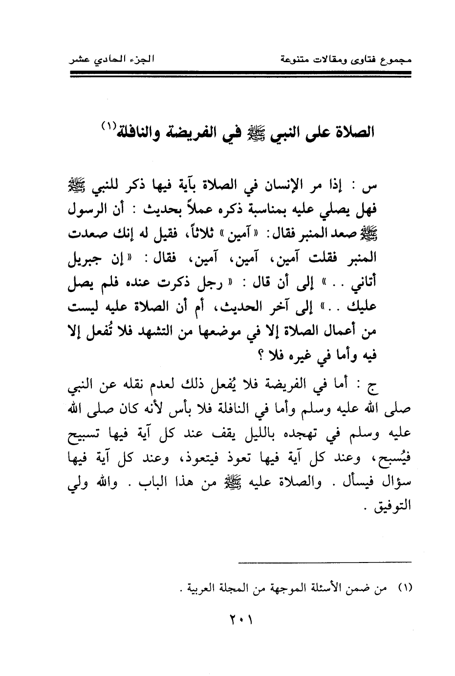س: إذا مر الإنسان في الصلاة بآية فيها ذكر للنبي صلى الله عليه وسلم فهل يصلي عليه بمناسبة ذكره عملا بحديث: «أن الرسول صلى الله عليه وسلم صعد المنبر فقال: آمين ثلاثا، فقيل له: إنك صعدت المنبر فقلت: آمين آمين آمين. فقال: إن جبريل أتاني» ... إلى أن قال: «رجل ذكرت عنده فلم يصل عليك (¬1) » إلى آخر الحديث، أم أن الصلاة عليه ليست من أعمال الصلاة إلا في موضعها من التشهد فلا تفعل إلا فيه وأما في غيره فلا؟ .