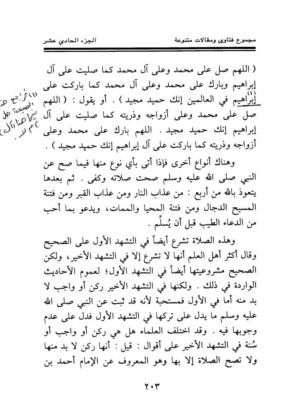 وهذه الصلاة تشرع أيضا في التشهد الأول على الصحيح وقال أكثر أهل العلم: إنها لا تشرع إلا في التشهد الأخير، ولكن الصحيح مشروعيتها أيضا في التشهد الأول، لعموم الأحاديث الواردة في ذلك. ولكنها في التشهد الأخير ركن أو واجب لا بد منه أما في الأول فمستحبة لأنه قد ثبت عن النبي صلى الله عليه وسلم ما يدل على تركها في التشهد الأول فدل على عدم وجوبها فيه. وقد اختلف العلماء هل هي ركن أو واجب أو سنة في التشهد الأخير على أقوال: قيل: إنها ركن لا بد منها ولا تصح الصلاة إلا بها وهو المعروف عن الإمام أحمد بن