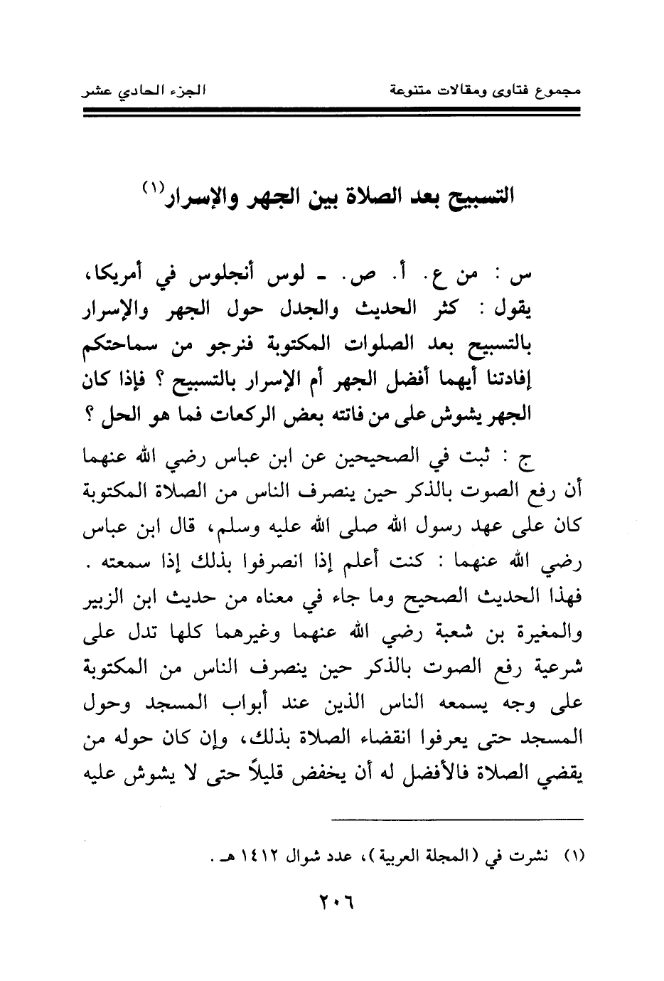 ج: ثبت في الصحيحين عن ابن عباس رضي الله عنهما «أن رفع الصوت بالذكر حين ينصرف الناس من الصلاة المكتوبة كان على عهد رسول الله صلى الله عليه وسلم قال ابن عباس رضي الله عنهما كنت أعلم إذا انصرفوا بذلك إذا سمعته (¬1) » .