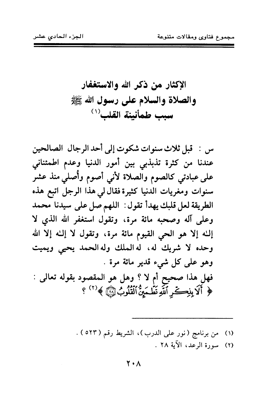 س: قبل ثلاث سنوات شكوت إلى أحد الرجال الصالحين عندنا من كثرة تذبذبي بين أمور الدنيا وعدم اطمئناني على عبادتي كالصوم والصلاة لأني أصوم وأصلي منذ عشر سنوات ومغريات الدنيا كبيرة فقال لي هذا الرجل اتبع هذه الطريقة لعل قلبك يهدأ تقول: اللهم صل على سيدنا محمد وعلى آله وصحبه مائة مرة، وتقول: استغفر الله الذي لا إله إلا هو الحي القيوم مائة مرة، وتقول: لا إله إلا الله وحده لا شريك له، له الملك وله الحمد يحيي ويميت وهو على كل شيء قدير مائة مرة.