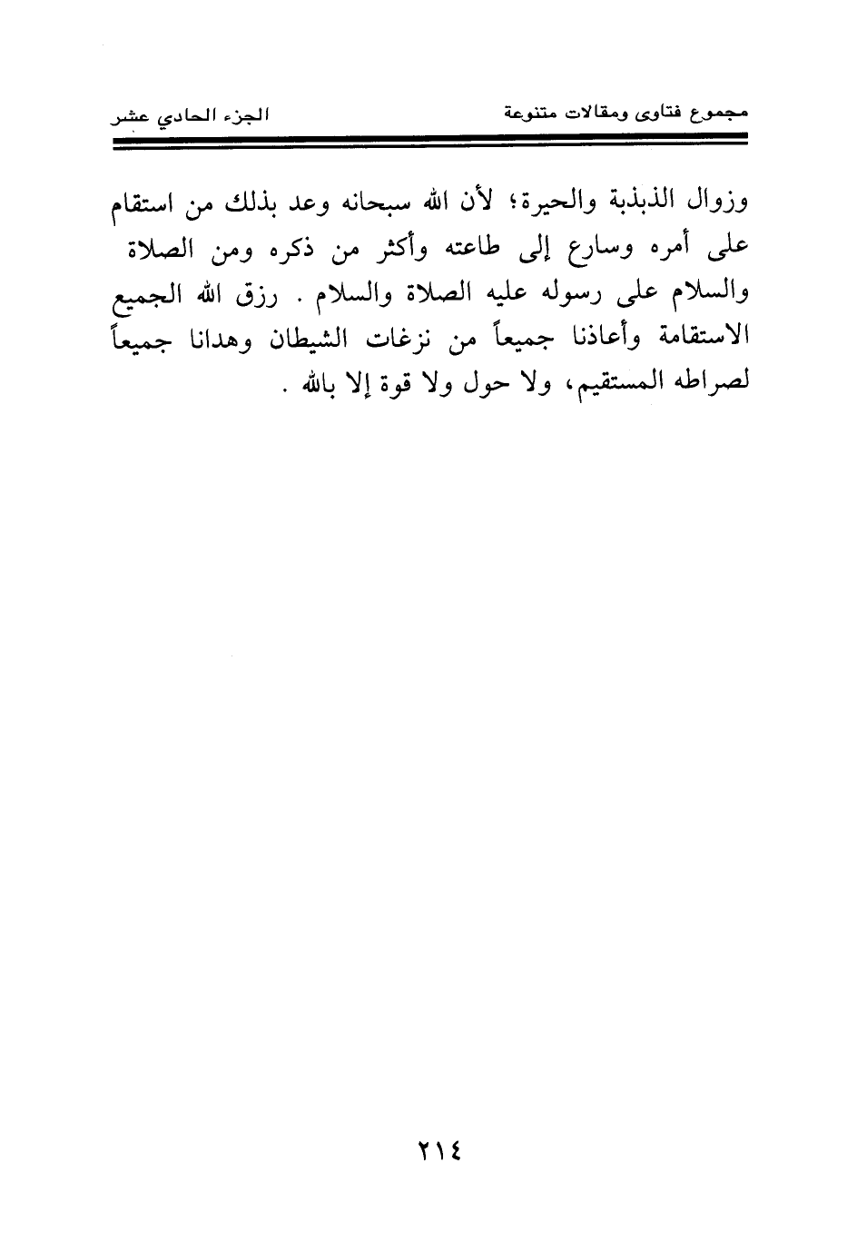 وزوال الذبذبة والحيرة؛ لأن الله سبحانه وعد بذلك من استقام على أمره وسارع إلى طاعته وأكثر من ذكره ومن الصلاة والسلام على رسوله عليه الصلاة والسلام. رزق الله الجميع الاستقامة وأعاذنا جميعا من نزغات الشيطان وهدانا جميعا لصراطه المستقيم، ولا حول ولا قوة إلا بالله.