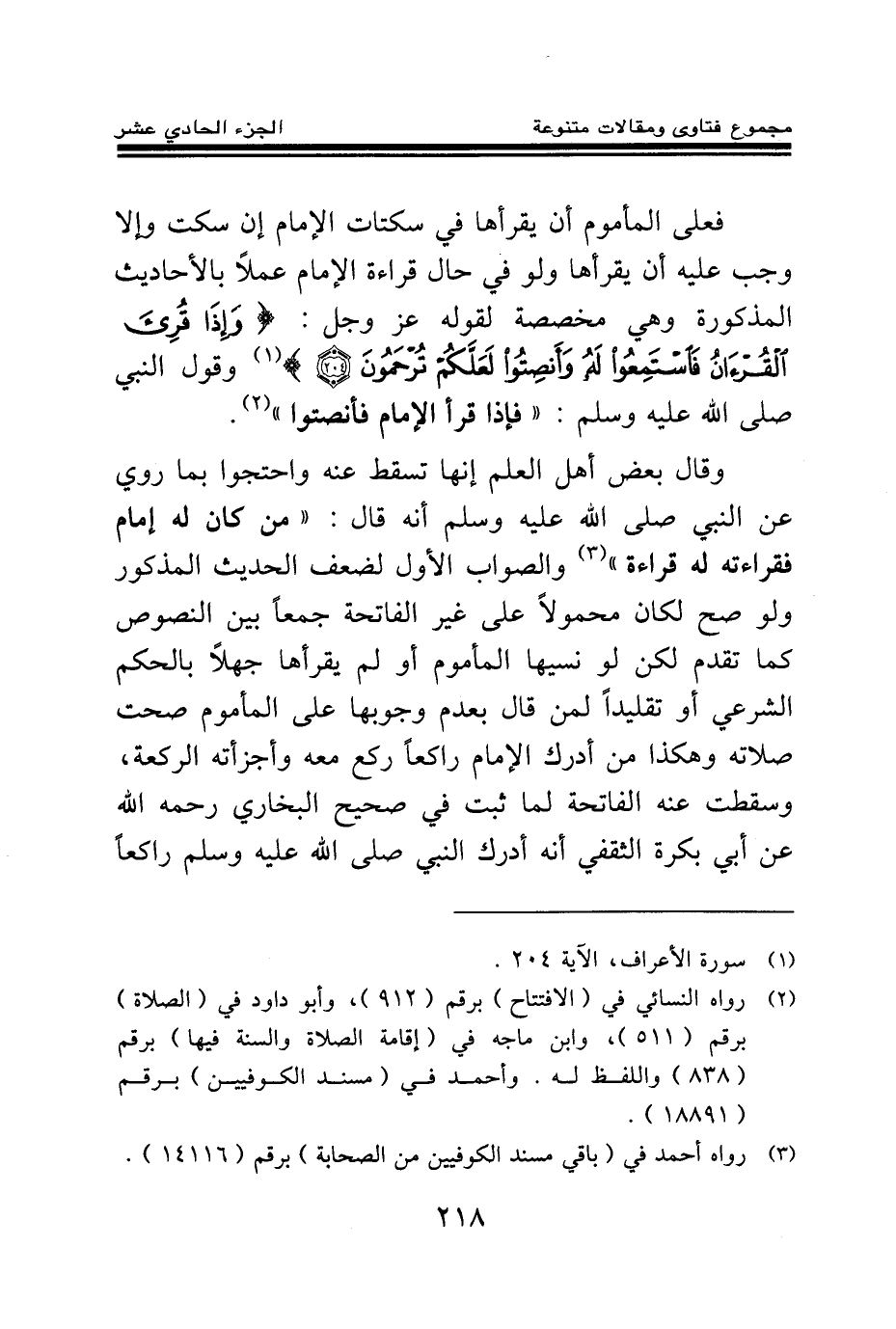 فعلى المأموم أن يقرأها في سكتات الإمام إن سكت وإلا وجب عليه أن يقرأها ولو في حال قراءة الإمام عملا بالأحاديث المذكورة وهي مخصصة لقوله عز وجل: {وَإِذَا قُرِئَ الْقُرْآنُ فَاسْتَمِعُوا لَهُ وَأَنْصِتُوا لَعَلَّكُمْ تُرْحَمُونَ} (¬1) وقول النبي صلى الله عليه وسلم: «فإذا قرأ الإمام فأنصتوا» .