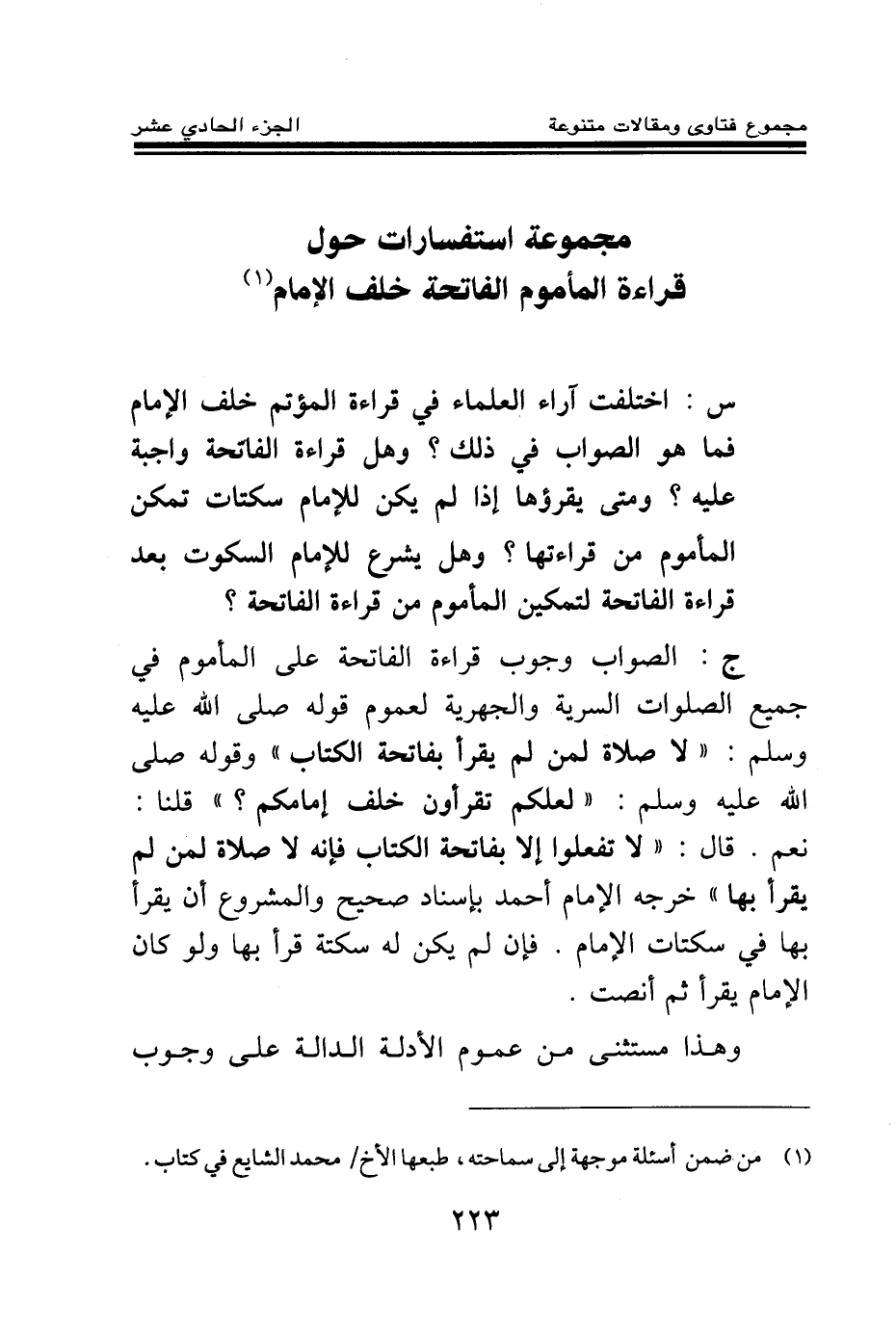 ج: الصواب وجوب قراءة الفاتحة على المأموم في جميع الصلوات السرية والجهرية لعموم قوله صلى الله عليه وسلم: «لا صلاة لمن لم يقرأ بفاتحة الكتاب (¬1) » وقوله صلى الله عليه وسلم: «لعلكم تقرءون خلف إمامكم؟ قلنا: نعم. قال: لا تفعلوا إلا بفاتحة الكتاب فإنه لا صلاة لمن لم يقرأ بها (¬2) » خرجه الإمام أحمد بإسناد صحيح والمشروع أن يقرأ بها في سكتات الإمام. فان لم يكن له سكتة قرأ بها ولو كان الإمام يقرأ ثم أنصت.