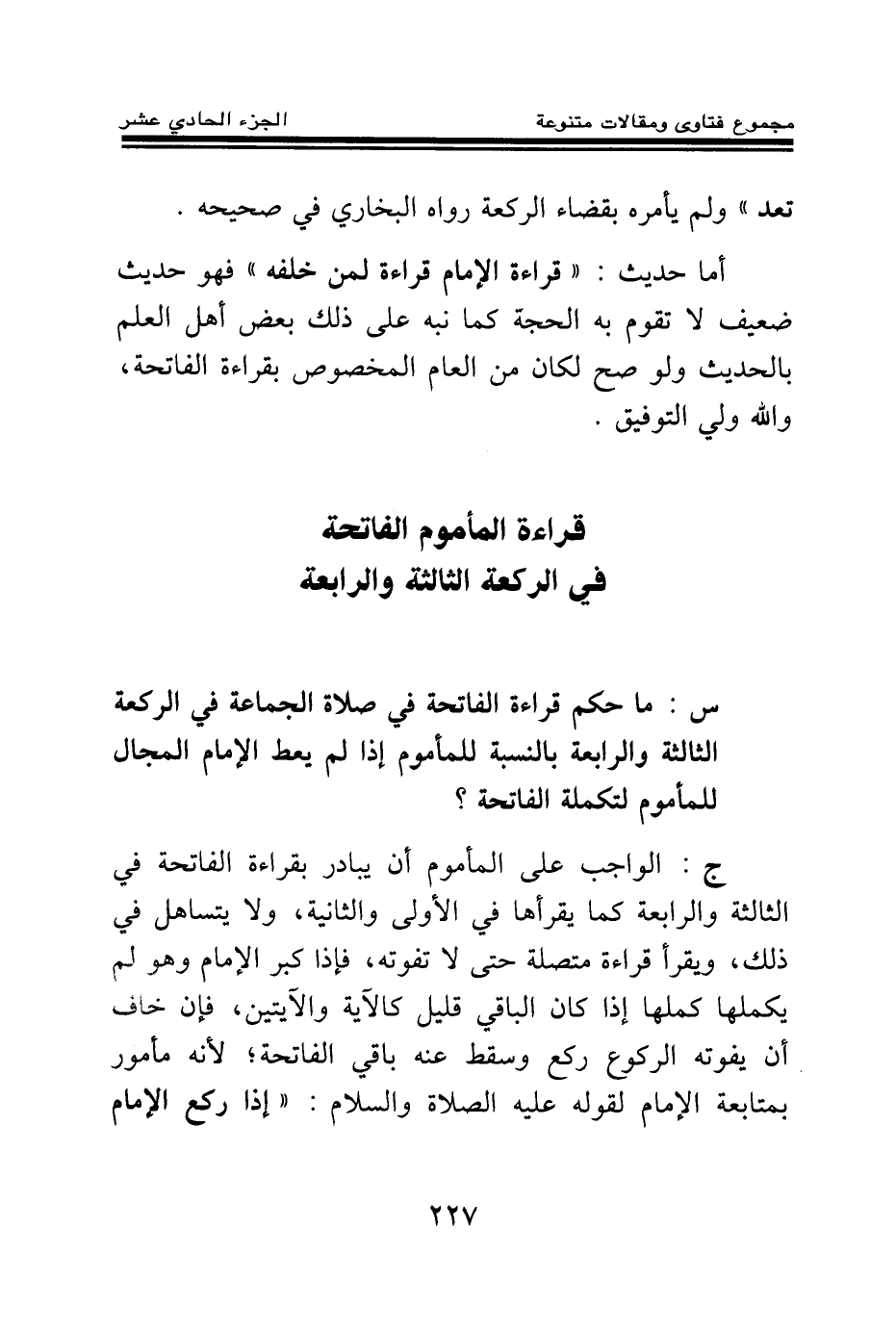 أما حديث: «قراءة الإمام قراءة لمن خلفه (¬2) » فهو حديث ضعيف لا تقوم به الحجة كما نبه على ذلك بعض أهل العلم بالحديث ولو صح لكان من العام المخصوص بقراءة الفاتحة، والله ولي التوفيق.