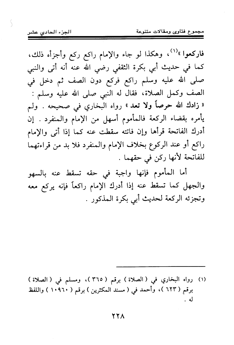 أما المأموم فإنها واجبة في حقه تسقط عنه بالسهو والجهل كما تسقط عنه إذا أدرك الإمام راكعا فإنه يركع معه وتجزئه الركعة لحديث أبي بكرة المذكور.