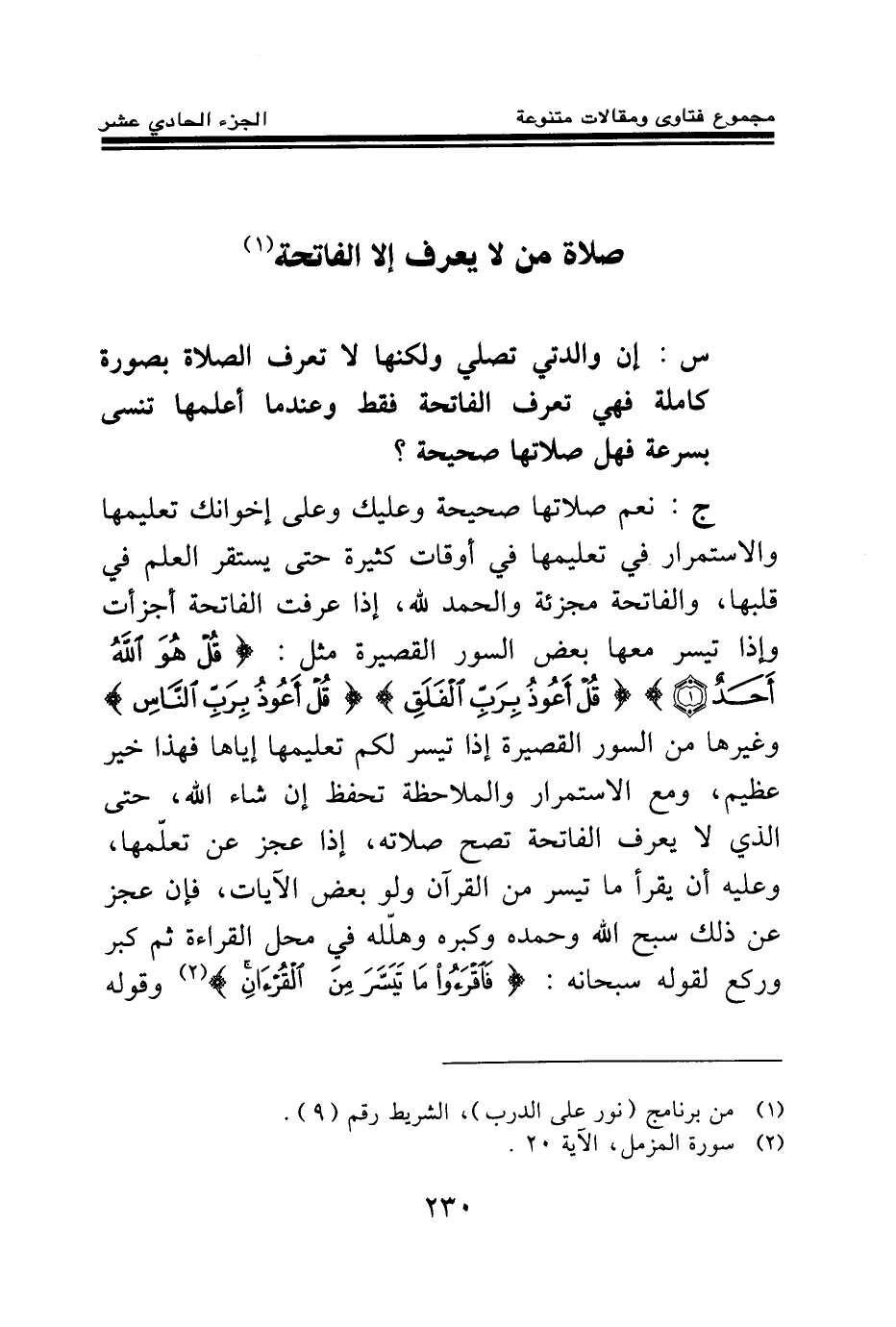ج: نعم صلاتها صحيحة وعليك وعلى إخوانك تعليمها والاستمرار في تعليمها في أوقات كثيرة حتى يستقر العلم في قلبها، والفاتحة مجزئة والحمد لله، إذا عرفت الفاتحة أجزأت وإذا تيسر معها بعض السور القصيرة مثل: {قُلْ هُوَ اللَّهُ أَحَدٌ} (¬1) {قُلْ أَعُوذُ بِرَبِّ الْفَلَقِ} (¬2) {قُلْ أَعُوذُ بِرَبِّ النَّاسِ} (¬3) وغيرها من السور القصيرة إذا تيسر لكم تعليمها إياها فهذا خير عظيم، ومع الاستمرار والملاحظة تحفظ إن شاء الله، حتى الذي لا يعرف الفاتحة تصح صلاته، إذا عجز عن تعلمها، وعليه أن يقرأ ما تيسر من القرآن ولو بعض الآيات، فإن عجز عن ذلك سبح الله وحمده وكبره وهلله في محل القراءة ثم كبر وركع لقوله سبحانه: {فَاقْرَءُوا مَا تَيَسَّرَ مِنَ الْقُرْآنِ} (¬4)