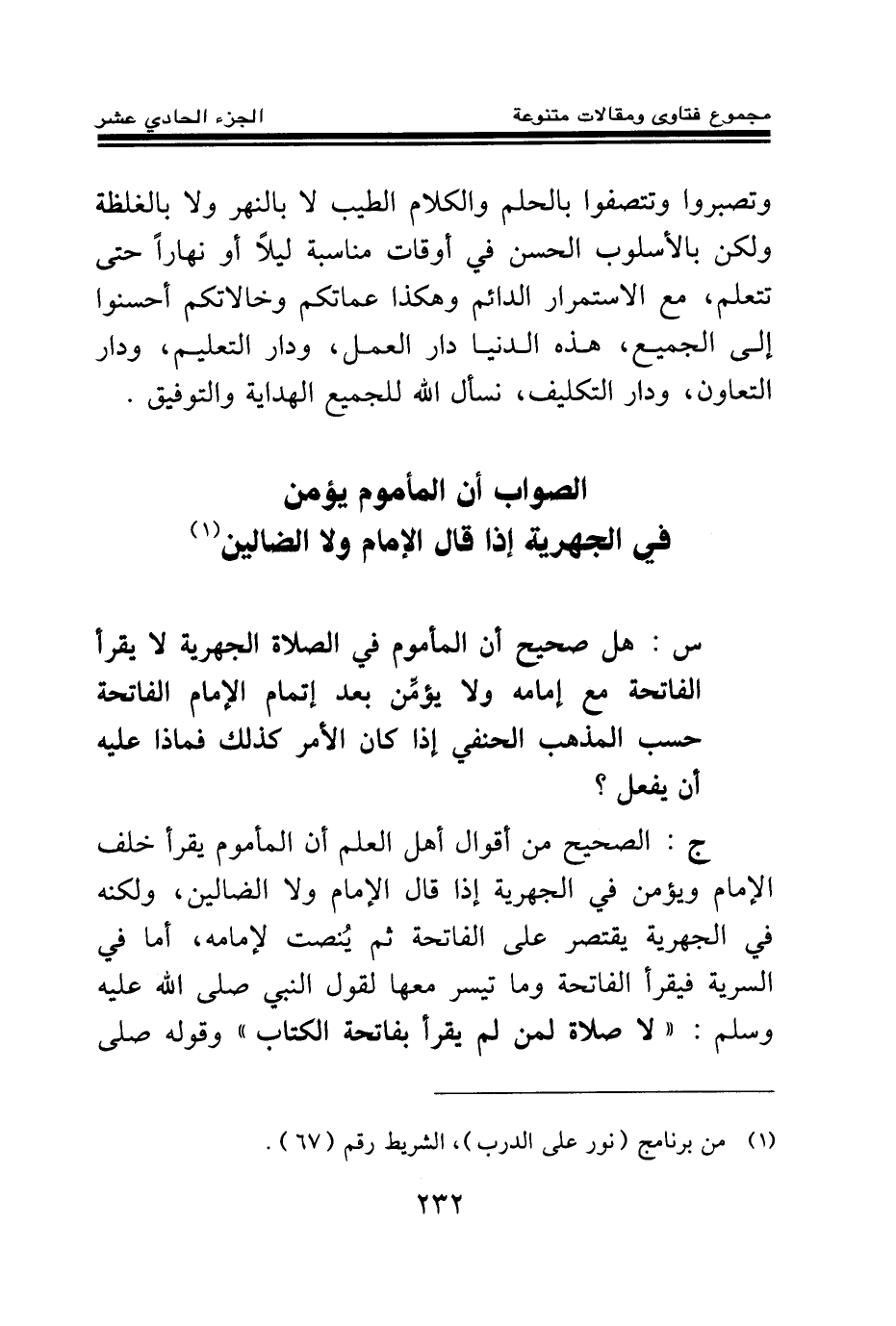 الصواب أن المأموم يؤمن في الجهرية إذا قال الإمام ولا الضالين (¬1) .