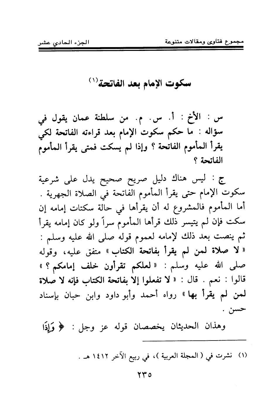 ج: ليس هناك دليل صريح صحيح يدل على شرعية سكوت الإمام حتى يقرأ المأموم الفاتحة في الصلاة الجهرية. أما المأموم فالمشروع له أن يقرأها في حالة سكتات إمامه إن سكت فان لم يتيسر ذلك قرأها المأموم سرا ولو كان إمامه يقرأ ثم ينصت بعد ذلك لإمامه لعموم قوله صلى الله عليه وسلم: «لا صلاة لمن لم يقرا بفاتحة الكتاب (¬1) » متفق عليه، وقوله صلى الله عليه وسلم: «لعلكم تقرءون خلف إمامكم؟ قالوا: نعم. قال: لا تفعلوا إلا بفاتحة الكتاب فإنه لا صلاة لمن لم يقرأ بها (¬2) » رواه أحمد وأبو داود وابن حبان بإسناد حسن.