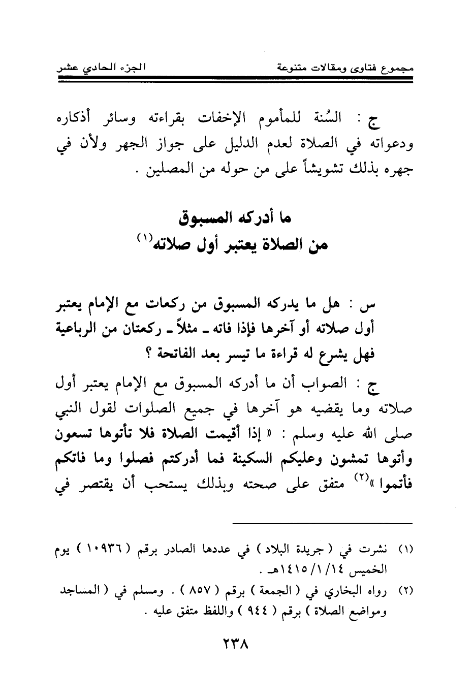 ج:: الصواب أن ما أدركه المسبوق مع الإمام يعتبر أول صلاته وما يقضيه هو آخرها في جميع الصلوات لقول النبي صلى الله عليه وسلم: «إذا أقيمت الصلاة فلا تأتوها تسعون وأتوها تمشون وعليكم السكينة فما أدركتم فصلوا وما فاتكم فأتموا (¬2) » . (¬3) . متفق على صحته وبذلك يستحب أن يقتصر في