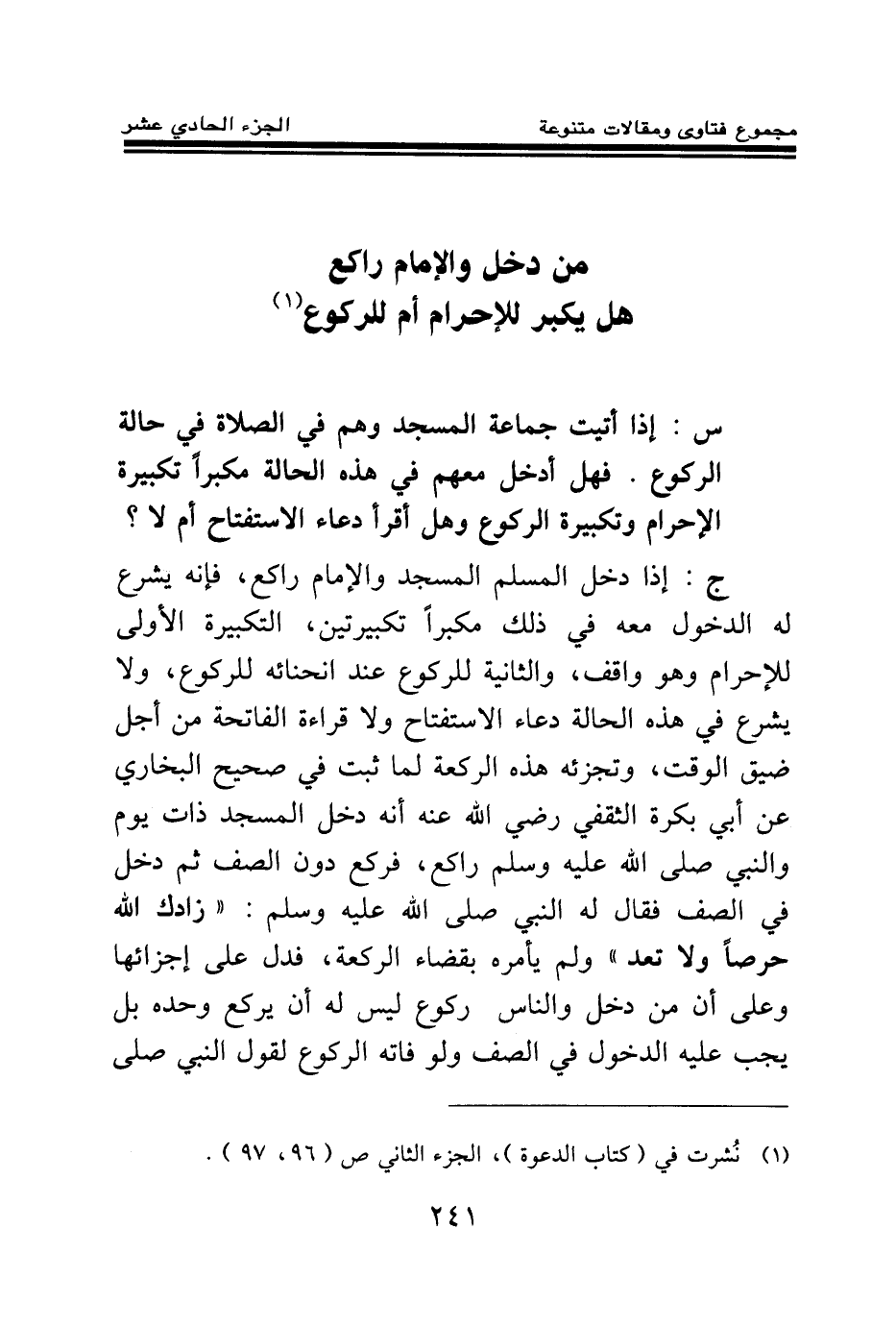 ج: إذا دخل المسلم المسجد والإمام راكع، فإنه يشرع له الدخول معه في ذلك مكبرا تكبيرتين، التكبيرة الأولى للإحرام وهو واقف، والثانية للركوع عند انحنائه للركوع، ولا يشرع في هذه الحالة دعاء الاستفتاح ولا قراءة الفاتحة من أجل ضيق الوقت، وتجزئه هذه الركعة لما ثبت في صحيح البخاري عن أبي بكرة الثقفي رضي الله عنه «أنه دخل المسجد ذات يوم والنبي صلى الله عليه وسلم راكع، فركع دون الصف ثم دخل في الصف فقال له النبي صلى الله عليه وسلم: زادك الله حرصا ولا تعد (¬1) » ولم يأمره بقضاء الركعة، فدل على إجزائها وعلى أن من دخل والناس ركوع ليس له أن يركع وحده بل يجب عليه الدخول في الصف ولو فاته الركوع لقول النبي صلى الله عليه وسلم