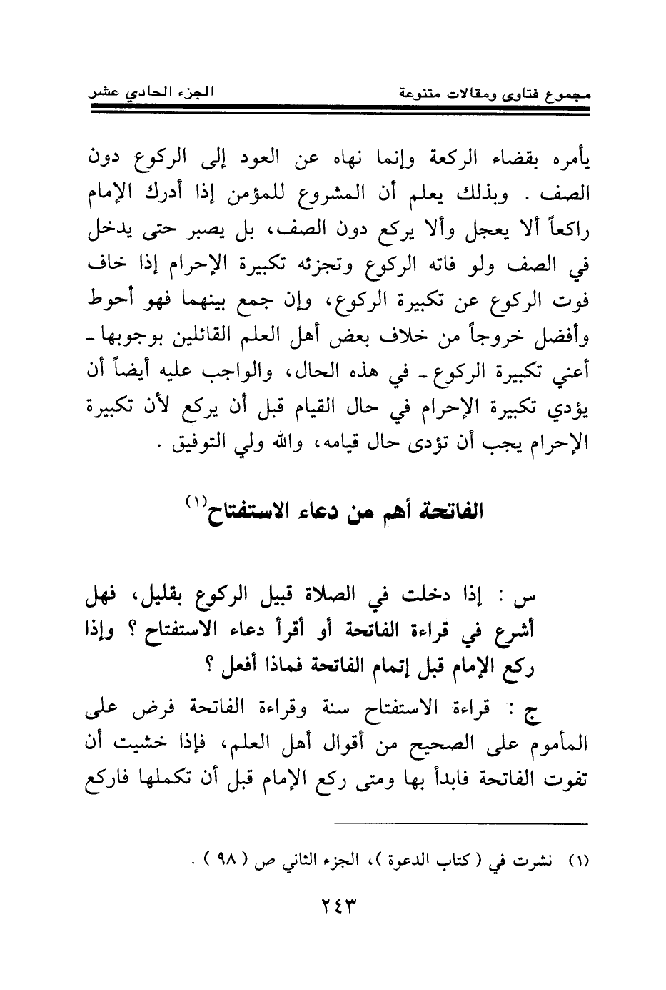 وبذلك يعلم أن المشروع للمؤمن إذا أدرك الإمام راكعا ألا يعجل وألا يركع دون الصف، بل يصبر حتى يدخل في الصف ولو فاته الركوع وتجزئه تكبيرة الإحرام إذا خاف فوت الركوع عن تكبيرة الركوع، وإن جمع بينهما فهو أحوط وأفضل خروجا من خلاف بعض أهل العلم القائلين بوجوبها- أعني تكبيرة الركوع- في هذه الحال، والواجب عليه أيضا أن يؤدي تكبيرة الإحرام في حال القيام قبل أن يركع لأن تكبيرة الإحرام يجب أن تؤدى حال قيامه، والله ولي التوفيق.