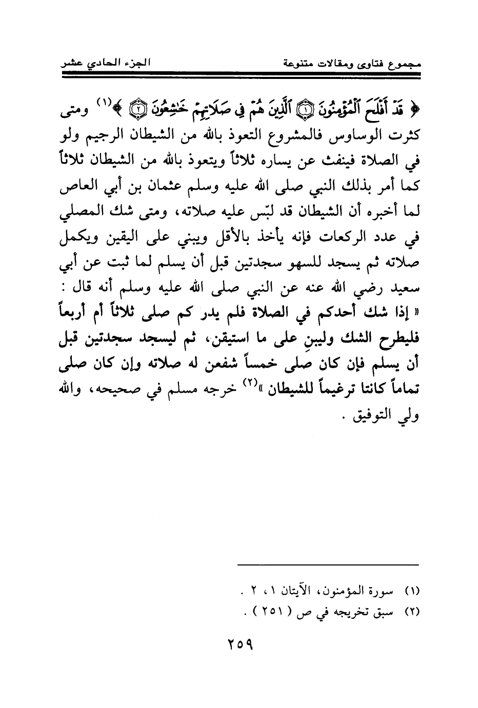 {قَدْ أَفْلَحَ الْمُؤْمِنُونَ} (¬1) {الَّذِينَ هُمْ فِي صَلَاتِهِمْ خَاشِعُونَ} (¬2) ومتى كثرت الوساوس فالمشروع التعوذ بالله من الشيطان الرجيم ولو في الصلاة، فينفث عن يساره ثلاثا ويتعوذ بالله من الشيطان ثلاثا كما أمر بذلك النبي صلى الله عليه وسلم عثمان بن أبي العاص لما أخبره أن الشيطان قد لبس عليه صلاته، ومتى شك المصلي في عدد الركعات فإنه يأخذ بالأقل، ويبني على اليقين ويكمل صلاته، ثم يسجد للسهو سجدتين قبل أن يسلم؛ لما ثبت عن أبي سعيد رضي الله عنه عن النبي صلى الله عليه وسلم أنه قال: «إذا شك أحدكم في الصلاة فلم يدر كم صلى ثلاثا أم أربعا فليطرح الشك، وليبن على ما استيقن، ثم ليسجد سجدتين قبل أن يسلم، فإن كان صلى خمسا شفعن له صلاته، وإن كان صلى تماما كانتا ترغيما للشيطان (¬3) » . خرجه مسلم في صحيحه، والله ولي التوفيق.