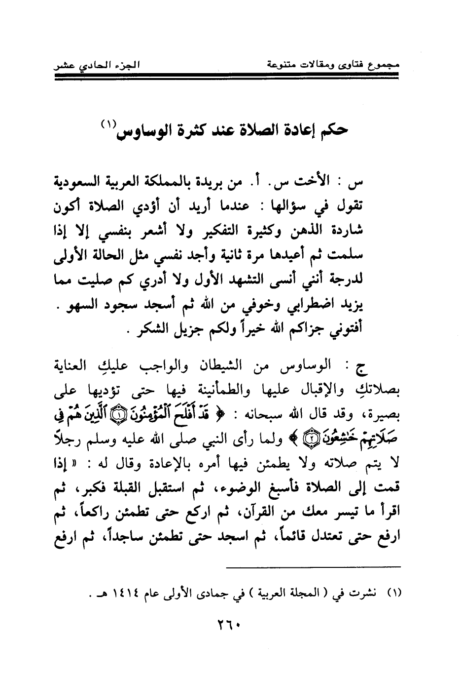 ج: الوساوس من الشيطان، والواجب عليك العناية بصلاتك والإقبال عليها، والطمأنينة فيها حتى تؤديها على بصيرة، وقد قال الله سبحانه: {قَدْ أَفْلَحَ الْمُؤْمِنُونَ} (¬1) {الَّذِينَ هُمْ فِي صَلَاتِهِمْ خَاشِعُونَ} (¬2) ولما رأى النبي صلى الله عليه وسلم رجلا لا يتم صلاته ولا يطمئن فيها أمره بالإعادة وقال له: «إذا قمت إلى الصلاة فأسبغ الوضوء، ثم استقبل القبلة فكبر، ثم اقرأ ما تيسر معك من القرآن، ثم اركع حتى تطمئن راكعا، ثم ارفع حتى تعتدل قائما، ثم اسجد حتى تطمئن ساجدا، ثم ارفع