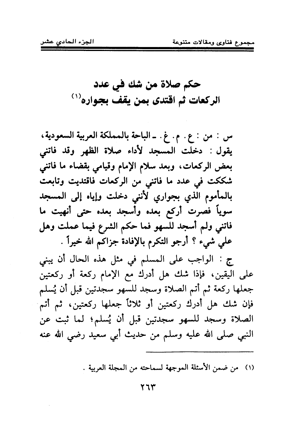 س: من: ع. م. غ. - الباحة بالمملكة العربية السعودية، يقول: دخلت المسجد لأداء صلاة الظهر وقد فاتني بعض الركعات، وبعد سلام الإمام وقيامي بقضاء ما فاتني شككت في عدد ما فاتني من الركعات، فاقتديت وتابعت بالمأموم الذي بجواري؛ لأنني دخلت وإياه إلى المسجد سويا، فصرت أركع بعده وأسجد بعده حتى أنهيت ما فاتني، ولم أسجد للسهو فما حكم الشرع فيما عملت، وهل علي شيء؟ أرجو التكرم بالإفادة جزاكم الله خيرا.