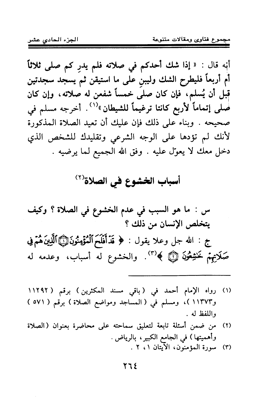 ج: الله جل وعلا يقول: {قَدْ أَفْلَحَ الْمُؤْمِنُونَ} (¬2) {الَّذِينَ هُمْ فِي صَلَاتِهِمْ خَاشِعُونَ} (¬3) والخشوع له أسباب، وعدمه له