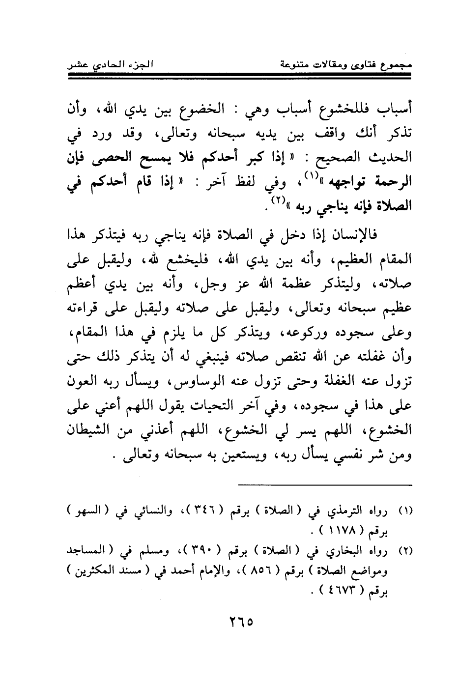 أسباب، فللخشوع أسباب وهي: الخضوع بين يدي الله، وأن تذكر أنك واقف بين يديه سبحانه وتعالى، وقد ورد في الحديث الصحيح: «إذا كبر أحدكم فلا يمسح الحصى فإن الرحمة تواجهه (¬1) » ، وفي لفظ آخر: «إذا قام أحدكم في الصلاة فإنه يناجي ربه (¬2) » .