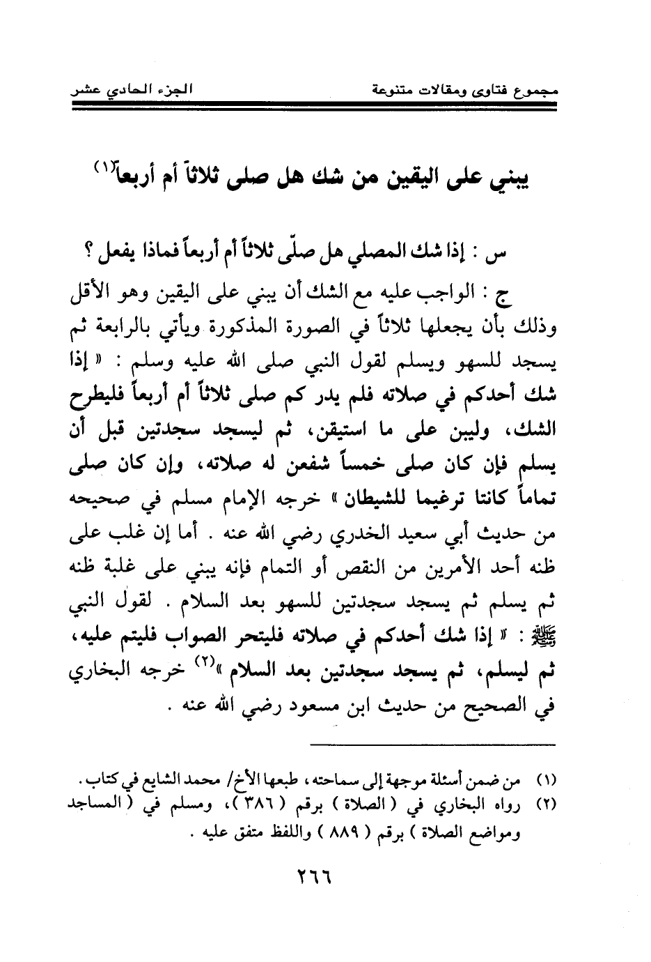 ج: الواجب عليه مع الشك أن يبني على اليقين وهو الأقل، وذلك بأن يجعلها ثلاثا في الصورة المذكورة، ويأتي بالرابعة ثم يسجد للسهو، ويسلم لقول النبي صلى الله عليه وسلم: «إذا شك أحدكم في صلاته، فلم يدر كم صلى ثلاثا أم أربعا فليطرح الشك وليبن على ما استيقن، ثم ليسجد سجدتين قبل أن يسلم، فإن كان صلى خمسا شفعن له صلاته، وإن كان صلى تماما كانتا ترغيما للشيطان (¬1) » خرجه الإمام مسلم في صحيحه من حديث أبي سعيد الخدري رضي الله عنه.