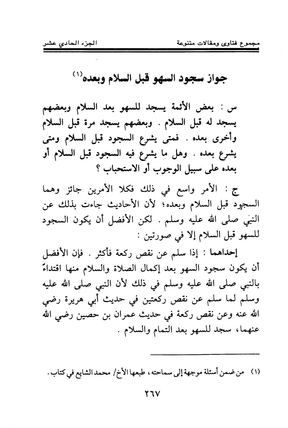 ج: الأمر واسع في ذلك فكلا الأمرين جائز وهما السجود قبل السلام وبعده؛ لأن الأحاديث جاءت بذلك عن النبي صلى الله عليه وسلم. لكن الأفضل أن يكون السجود للسهو قبل السلام إلا في صورتين: