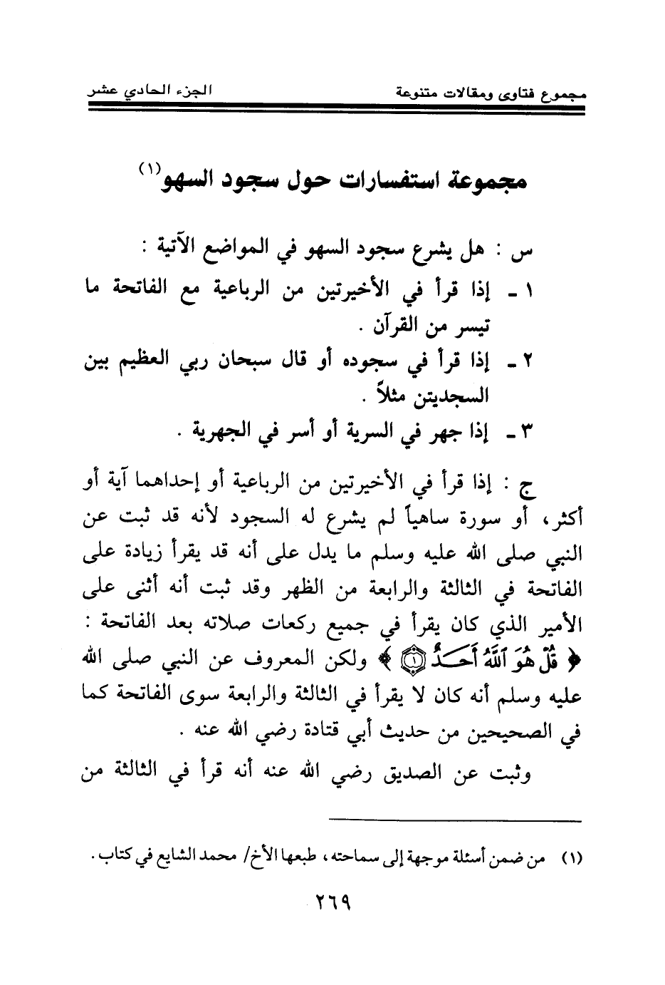 ج: إذا قرأ في الأخيرتين من الرباعية أو إحداهما آية أو أكثر، أو سورة ساهيا لم يشرع له السجود؛ لأنه قد ثبت عن النبي صلى الله عليه وسلم ما يدل على أنه قد يقرأ زيادة على الفاتحة في الثالثة والرابعة من الظهر، وقد ثبت أنه أثنى على الأمير الذي كان يقرأ في جميع ركعات صلاته بعد الفاتحة: {قُلْ هُوَ اللَّهُ أَحَدٌ} (¬1) ولكن المعروف عن النبي صلى الله عليه وسلم أنه كان لا يقرأ في الثالثة والرابعة سوى الفاتحة كما في الصحيحين من حديث أبي قتادة رضي الله عنه.