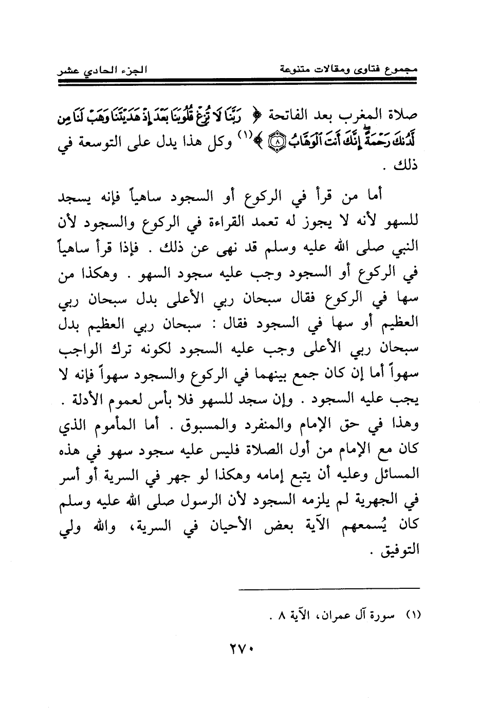صلاة المغرب بعد الفاتحة {رَبَّنَا لَا تُزِغْ قُلُوبَنَا بَعْدَ إِذْ هَدَيْتَنَا وَهَبْ لَنَا مِنْ لَدُنْكَ رَحْمَةً إِنَّكَ أَنْتَ الْوَهَّابُ} (¬1) وكل هذا يدل على التوسعة في ذلك.