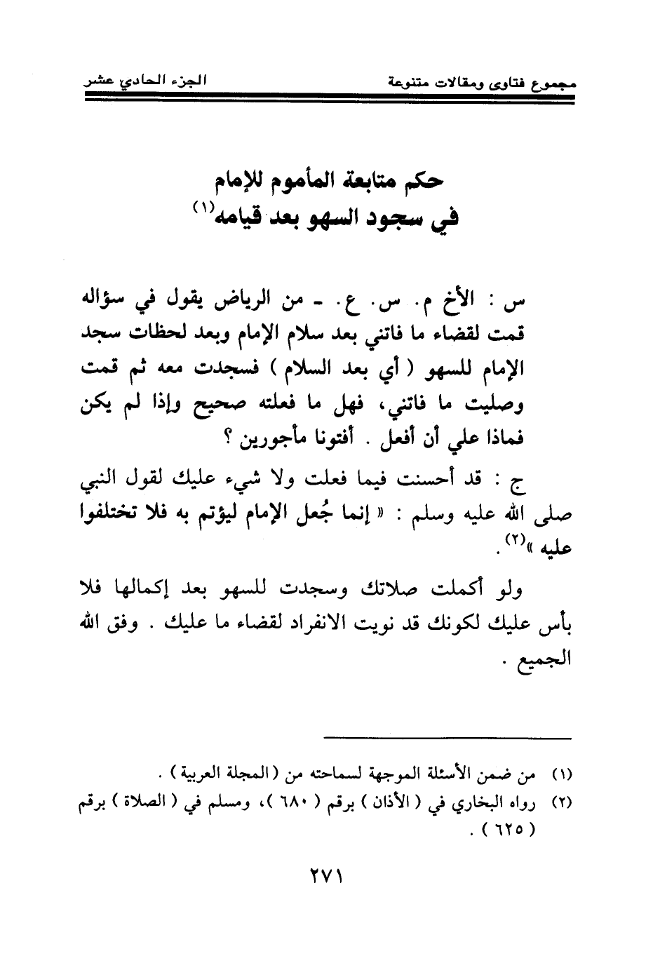 (¬1) رواه البخاري في (الأذان) برقم (680) ، ومسلم في (الصلاة) برقم (625) .