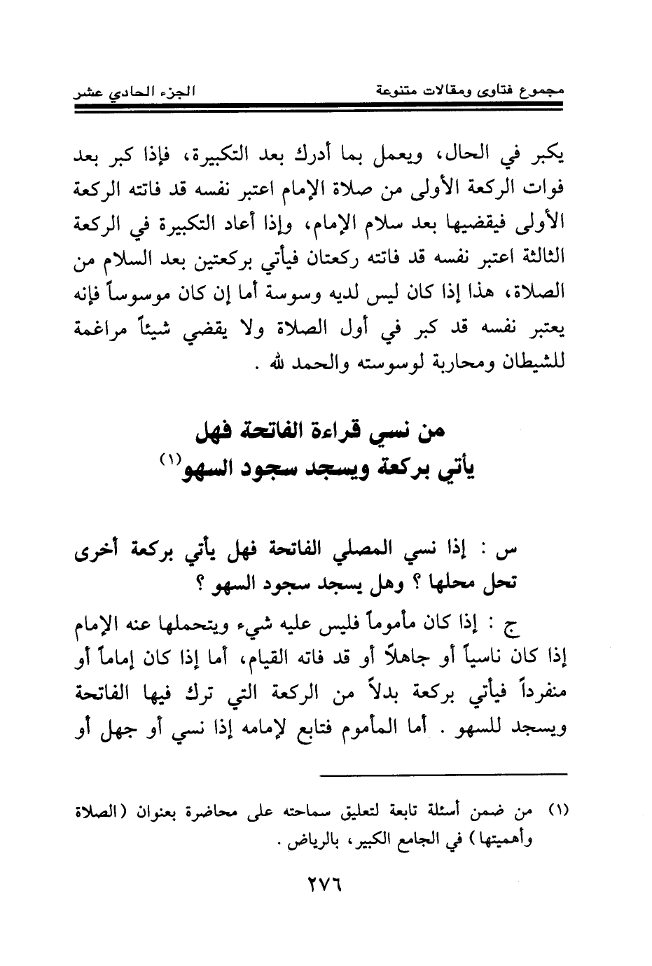 من نسي قراءة الفاتحة فهل يأتي بركعة ويسجد سجود السهو (¬1)