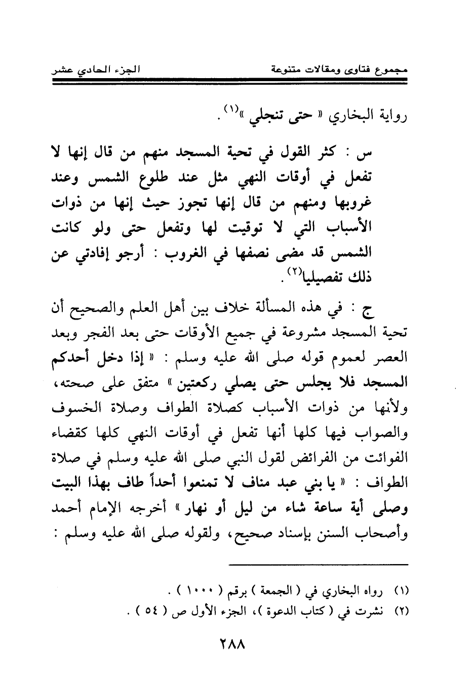 ج: في هذه المسألة خلاف بين أهل العلم، والصحيح أن تحية المسجد مشروعة في جميع الأوقات حتى بعد الفجر وبعد العصر؛ لعموم قوله صلى الله عليه وسلم: «إذا دخل أحدكم المسجد فلا يجلس حتى يصلي ركعتين (¬3) » متفق على صحته، ولأنها من ذوات الأسباب كصلاة الطواف وصلاة الخسوف والصواب فيها كلها أنها تفعل في أوقات النهي كلها كقضاء الفوائت من الفرائض لقول النبي صلى الله عليه وسلم في صلاة الطواف: «يا بني عبد مناف لا تمنعوا أحدا طاف بهذا البيت وصلى أية ساعة شاء من ليل أو نهار (¬4) » أخرجه الإمام أحمد وأصحاب السنن بإسناد صحيح، ولقوله صلى الله عليه وسلم: