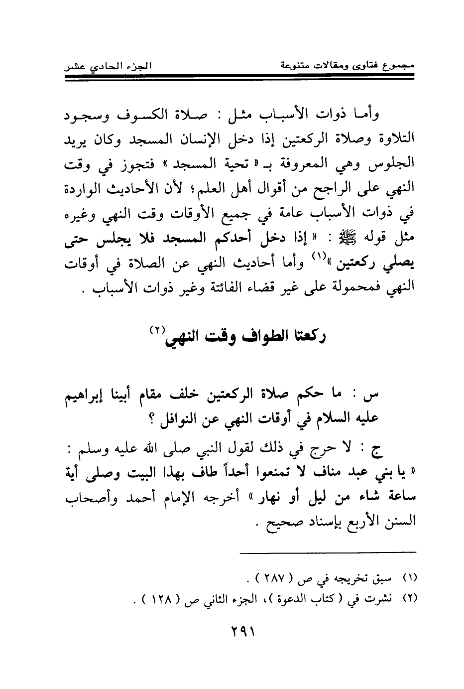 ج: لا حرج في ذلك لقول ال نبي صلى الله عليه وسلم: «يا بني عبد مناف لا تمنعوا أحدا طاف بهذا البيت وصلى أية ساعة شاء من ليل أو نهار (¬2) » أخرجه الإمام أحمد وأصحاب السنن الأربع بإسناد صحيح.
