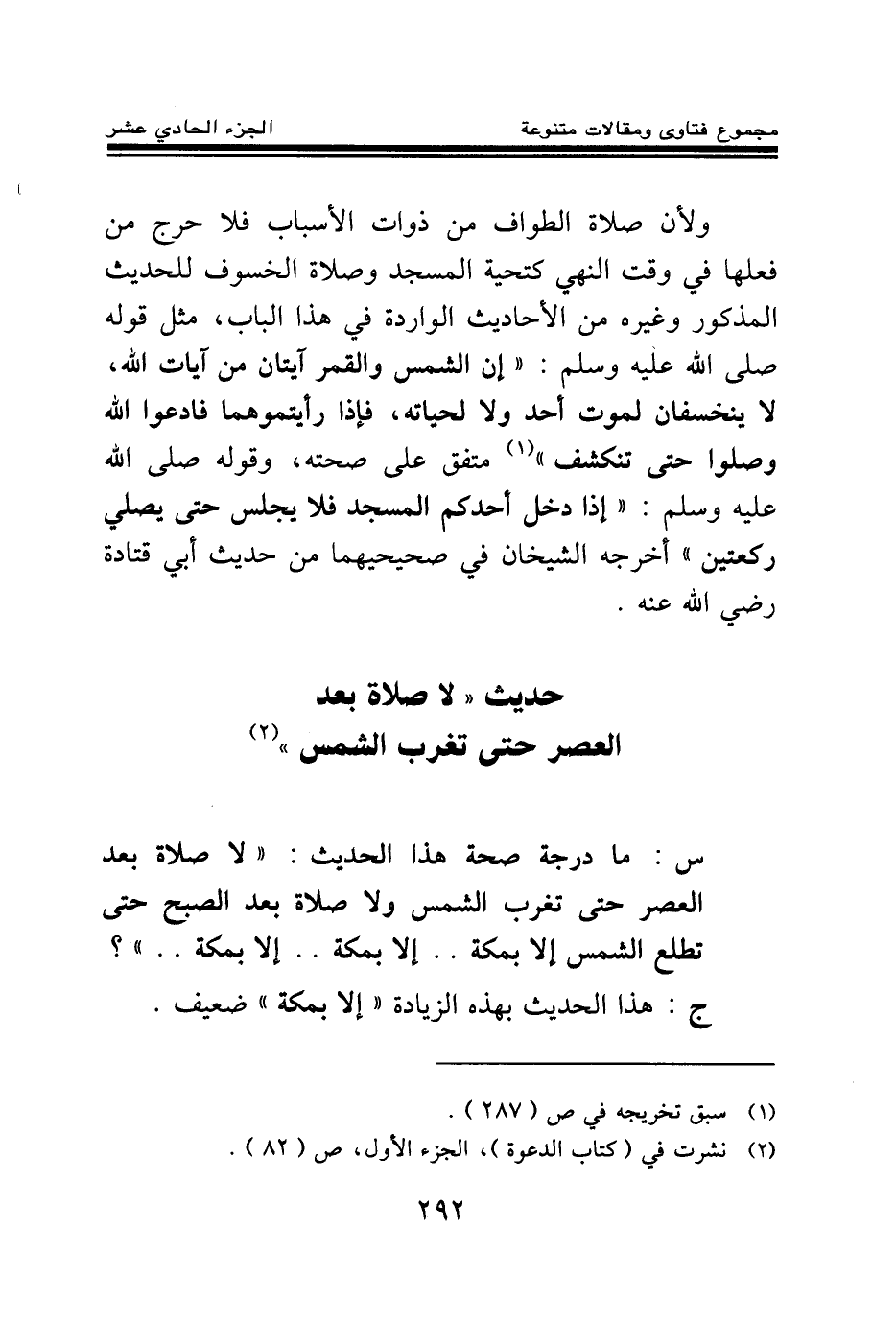 ولأن صلاة الطواف من ذوات الأسباب فلا حرج من فعلها في وقت النهي كتحية المسجد وصلاة الخسوف للحديث المذكور وغيره من الأحاديث الواردة في هذا الباب، مثل قوله صلى الله عليه وسلم: «إن الشمس والقمر آيتان من آيات الله لا ينخسفان لموت أحد ولا لحياته، فإذا رأيتموهما فادعوا الله وصلوا حتى تنكشف (¬1) » متفق على صحته، وقوله صلى الله عليه وسلم: «إذا دخل أحدكم المسجد فلا يجلس حتى يصلي ركعتين (¬2) » أخرجه الشيخان في صحيحيهما من حديث أبي قتادة رضي الله عنه.