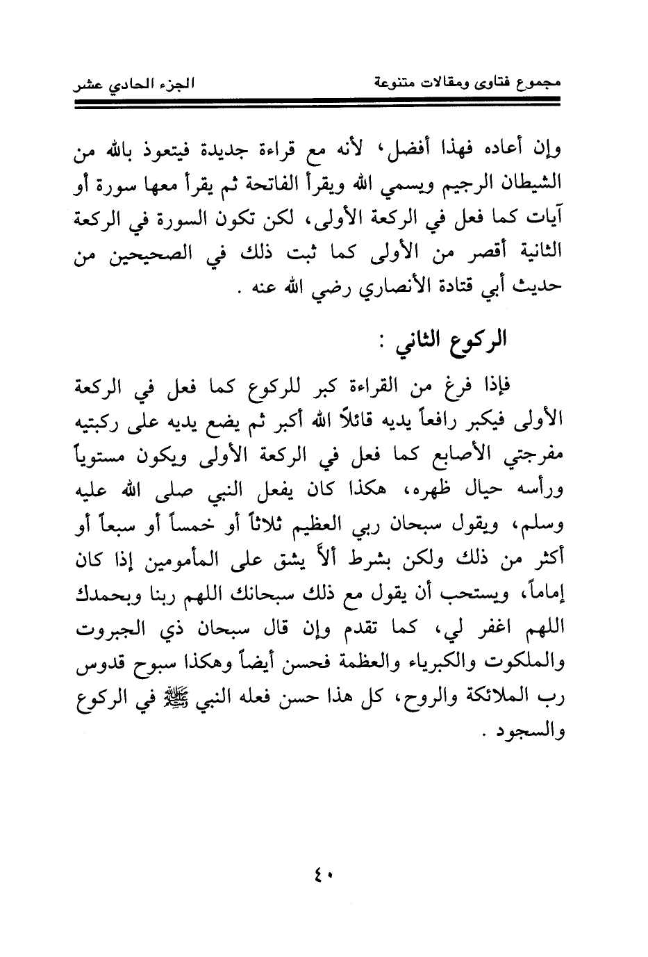 فإذا فرغ من القراءة كبر للركوع كما فعل في الركعة الأولى فيكبر رافعا يديه قائلا: الله أكبر ثم يضع يديه على ركبتيه مفرجتي الأصابع كما فعل في الركعة الأولى ويكون مستويا ورأسه حيال ظهره، هكذا كان يفعل النبي صلى الله عليه وسلم، ويقول سبحان ربي العظيم ثلاثا أو خمسا أو سبعا أو أكثر من ذلك ولكن بشرط ألا يشق على المأمومين إذا كان إماما، ويستحب أن يقول مع ذلك سبحانك اللهم ربنا وبحمدك اللهم اغفر لي، كما تقدم وإن قال سبحان ذي الجبروت والملكوت والكبرياء والعظمة فحسن أيضا وهكذا سبوح قدوس رب الملائكة والروح، كل هذا حسن فعله النبي صلى الله عليه وسلم في الركوع والسجود.