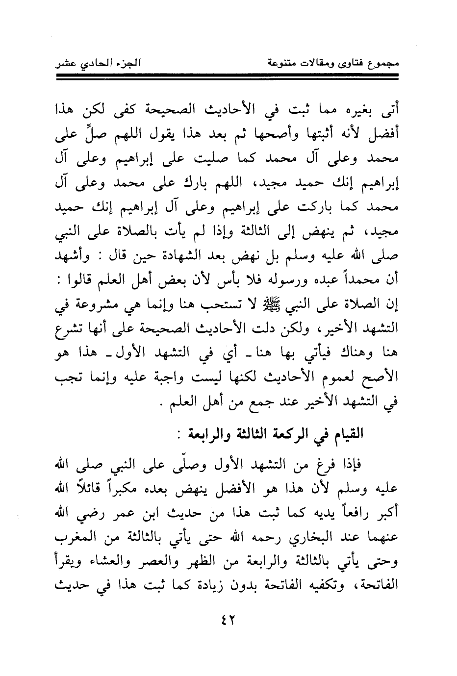 أتى بغيره مما ثبت في الأحاديث الصحيحة كفى لكن هذا أفضل لأنه أثبتها وأصحها ثم بعد هذا يقول: اللهم صل على محمد وعلى آل محمد كما صليت على إبراهيم وعلى آل إبراهيم إنك حميد مجيد، اللهم بارك على محمد وعلى آل محمد كما باركت على إبراهيم وعلى آل إبراهيم إنك حميد مجيد، ثم ينهض إلى الثالثة وإذا لم يأت بالصلاة على النبي صلى الله عليه وسلم بل نهض بعد الشهادة حين قال: وأشهد أن محمدا عبده ورسوله فلا بأس لأن بعض أهل العلم قالوا: إن الصلاة على النبي صلى الله عليه وسلم لا تستحب هنا وإنما هي مشروعة في التشهد الأخير، ولكن دلت الأحاديث الصحيحة على أنها تشرع هنا وهناك فيأتي بها هنا - أي في التشهد الأول - هذا هو الأصح لعموم الأحاديث لكنها ليست واجبة عليه وإنما تجب في التشهد الأخير عند جمع من أهل العلم.