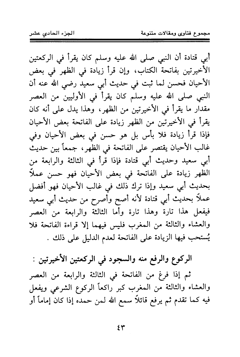 أبي قتادة أن النبي صلى الله عليه وسلم كان يقرأ في الركعتين الأخيرتين بفاتحة الكتاب، وإن قرأ زيادة في الظهر في بعض الأحيان فحسن لما ثبت في حديث أبي سعيد رضي الله عنه أن النبي صلى الله عليه وسلم كان يقرأ في الأوليين من العصر مقدار ما يقرأ في الأخيرتين من الظهر، وهذا يدل على أنه كان يقرأ في الأخيرتين من الظهر زيادة على الفاتحة بعض الأحيان فإذا قرأ زيادة فلا بأس بل هو حسن في بعض الأحيان وفي غالب الأحيان يقتصر على الفاتحة في الظهر، جمعا بين حديث أبي سعيد وحديث أبي قتادة فإذا قرأ في الثالثة والرابعة من الظهر زيادة على الفاتحة في بعض الأحيان فهو حسن عملا بحديث أبي سعيد وإذا ترك ذلك في غالب الأحيان فهو أفضل عملا بحديث أبي قتادة لأنه أصح وأصرح من حديث أبي سعيد فيفعل هذا تارة وهذا تارة وأما الثالثة والرابعة من العصر والعشاء والثالثة من المغرب فليس فيهما إلا قراءة الفاتحة فلا يستحب فيها الزيادة على الفاتحة لعدم الدليل على ذلك.