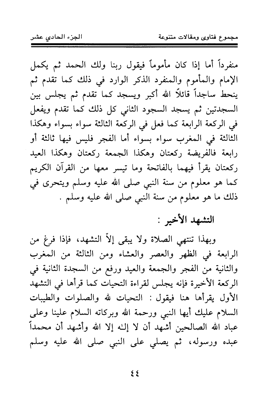 منفردا أما إذا كان مأموما فيقول: ربنا ولك الحمد ثم يكمل الإمام والمأموم والمنفرد الذكر الوارد في ذلك كما تقدم، ثم ينحط ساجدا قائلا: الله أكبر، ويسجد كما تقدم ثم يجلس بين السجدتين ثم يسجد السجود الثاني كل ذلك كما تقدم ويفعل في الركعة الرابعة كما فعل في الركعة الثالثة سواء بسواء، وهكذا الثالثة في المغرب سواء بسواء، أما الفجر فليس فيها ثالثة أو رابعة فالفريضة ركعتان وهكذا الجمعة ركعتان وهكذا العيد ركعتان يقرأ فيهما بالفاتحة وما تيسر معها من القرآن الكريم كما هو معلوم من سنة النبي صلى الله عليه وسلم ويتحرى في ذلك ما هو معلوم من سنة النبي صلى الله عليه وسلم.