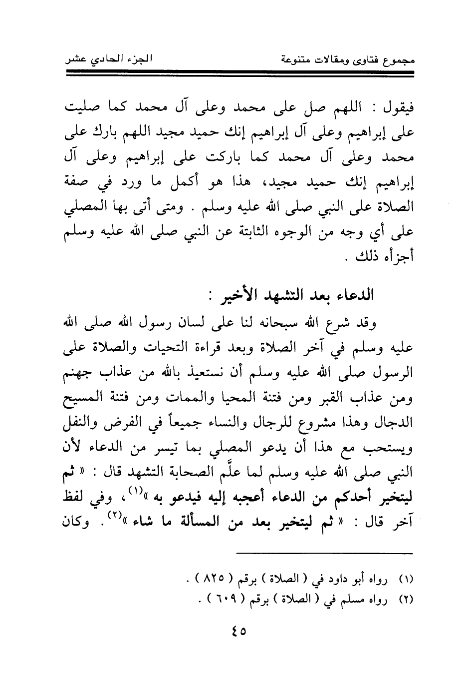 فيقول: اللهم صل على محمد وعلى آل محمد كما صليت على إبراهيم وعلى آل إبراهيم إنك حميد مجيد اللهم بارك على محمد وعلى آل محمد كما باركت على إبراهيم وعلى آل إبراهيم إنك حميد مجيد، هذا هو أكمل ما ورد في صفة الصلاة على النبي صلى الله عليه وسلم. ومتى أتى بها المصلي على أي وجه من الوجوه الثابتة عن النبي صلى الله عليه وسلم أجزأه ذلك.