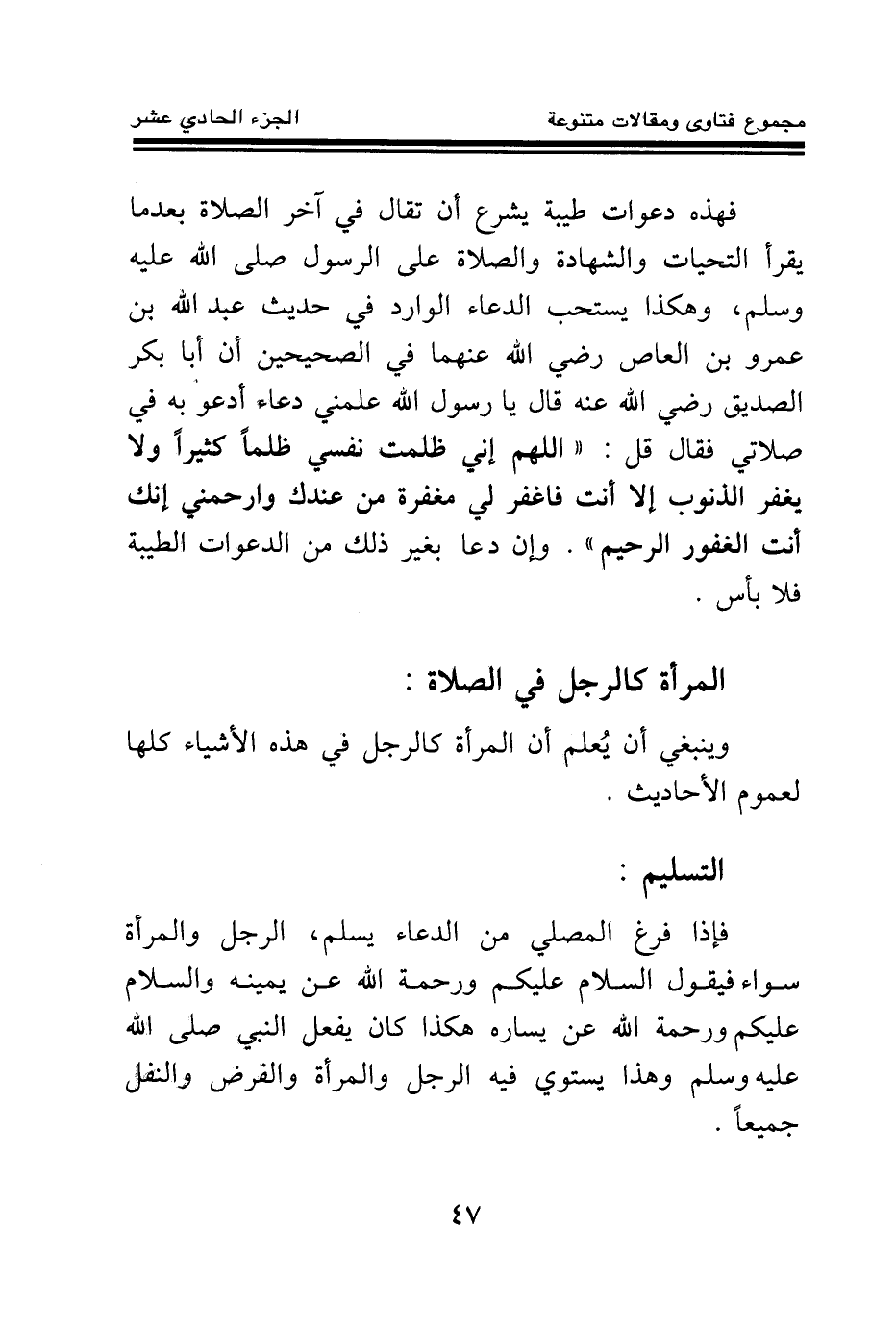 فهذه دعوات طيبة يشرع أن تقال في آخر الصلاة بعدما يقرأ التحيات والشهادة والصلاة على الرسول صلى الله عليه وسلم، وهكذا يستحب الدعاء الوارد في حديث عبد الله بن عمرو بن العاص رضي الله عنهما في الصحيحين أن أبا بكر الصديق رضي الله عنه قال يا رسول الله علمني دعاء أدعو به في صلاتي فقال قل: «اللهم إني ظلمت نفسي ظلما كثيرا ولا يغفر الذنوب إلا أنت فاغفر لي مغفرة من عندك وارحمني إنك أنت الغفور الرحيم (¬1) » وإن دعا بغير ذلك من الدعوات الطيبة فلا بأس.